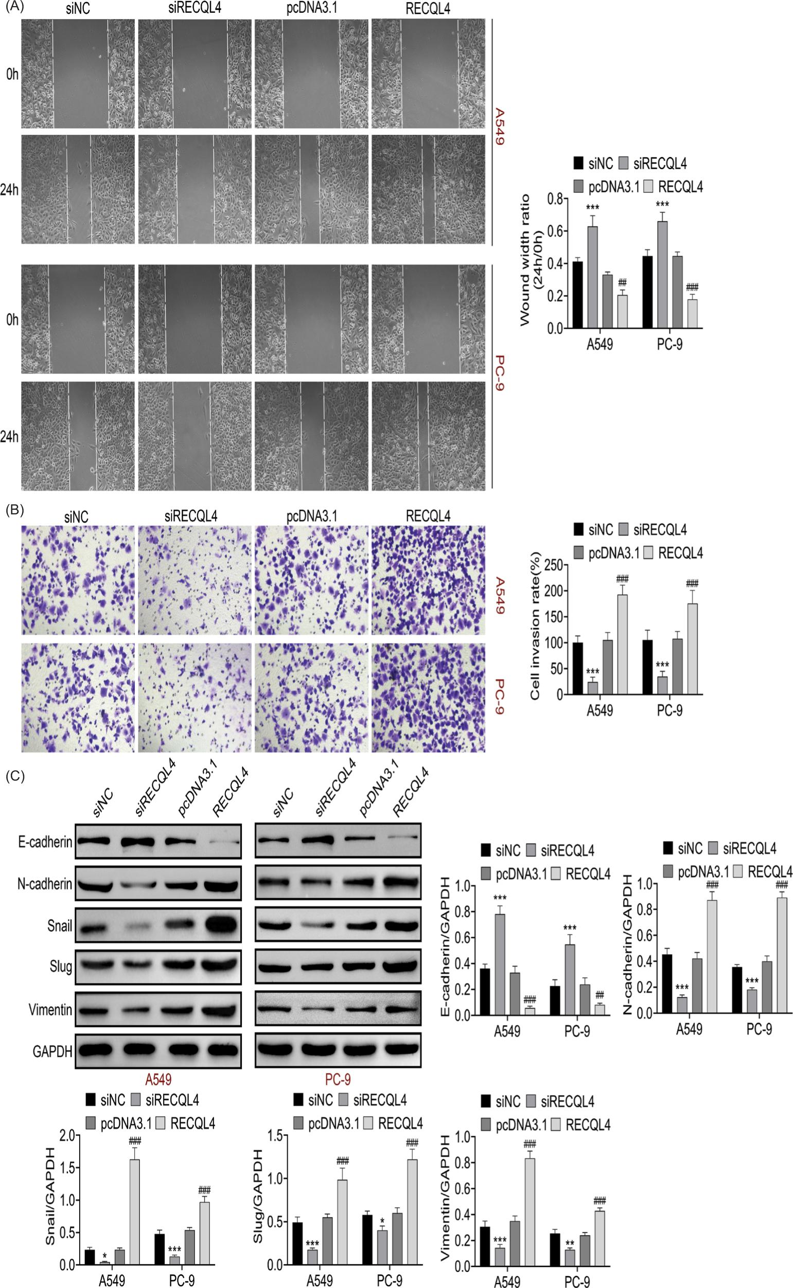 Figure 3 RECQL4 facilitated cell migration and invasion as well as EMT progression. (A) The migration ability was measured after inhibiting or overexpressing RECQL4 through wound healing assay. (B) The invasion ability was discovered after RECQL4 knockdown or overexpression through transwell assay. (C) The EMT progression-related proteins (E-cadherin, N-cadherin, snail, slug, and vimentin) were inspected by Western blot analysis. *P < 0.05, **P < 0.01, ***P < 0.001 vs siNC; ##P < 0.01, ###P < 0.001 vs pcDNA3.1. NC: negative control.