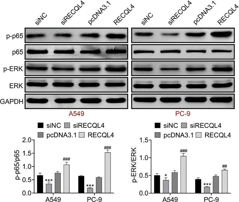 Figure 5 RECQL4 activated NF-κB and ERK signaling pathways. The protein expressions of p-p65, p65, p-ERK, and ERK were examined after silencing or overexpressing RECQL4 through Western blot analysis. *P < 0.05, ***P < 0.001 vs siNC; ##P < 0.01, ###P < 0.001 vs pcDNA3.1. NC: negative control.