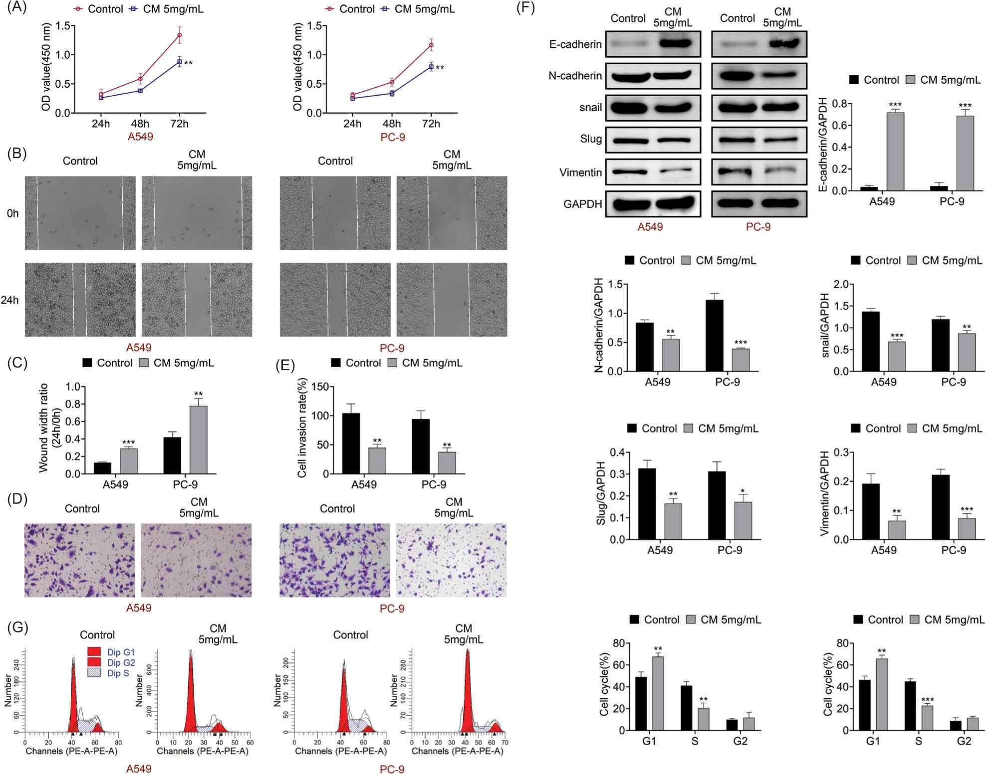Figure 6 Cortex Mori extract exhibited antitumor effects in LUAC. (A) Cell viability was measured after CM (5 mg/mL) treatment through CCK-8 assay. (B,C) Cell migration was tested after CM (5 mg/mL) treatment through wound healing assay. (D,E) Cell invasion was examined after CM (5 mg/mL) treatment through Transwell assay. (F) The protein expressions of E-cadherin, N-cadherin, snail, slug and vimentin were confirmed after CM (5 mg/mL) treatment through Western blot analysis. (G) The cell cycle was detected after CM (5 mg/mL) treatment through flow cytometry. *P < 0.05, **P < 0.01, ***P < 0.001 vs control.
