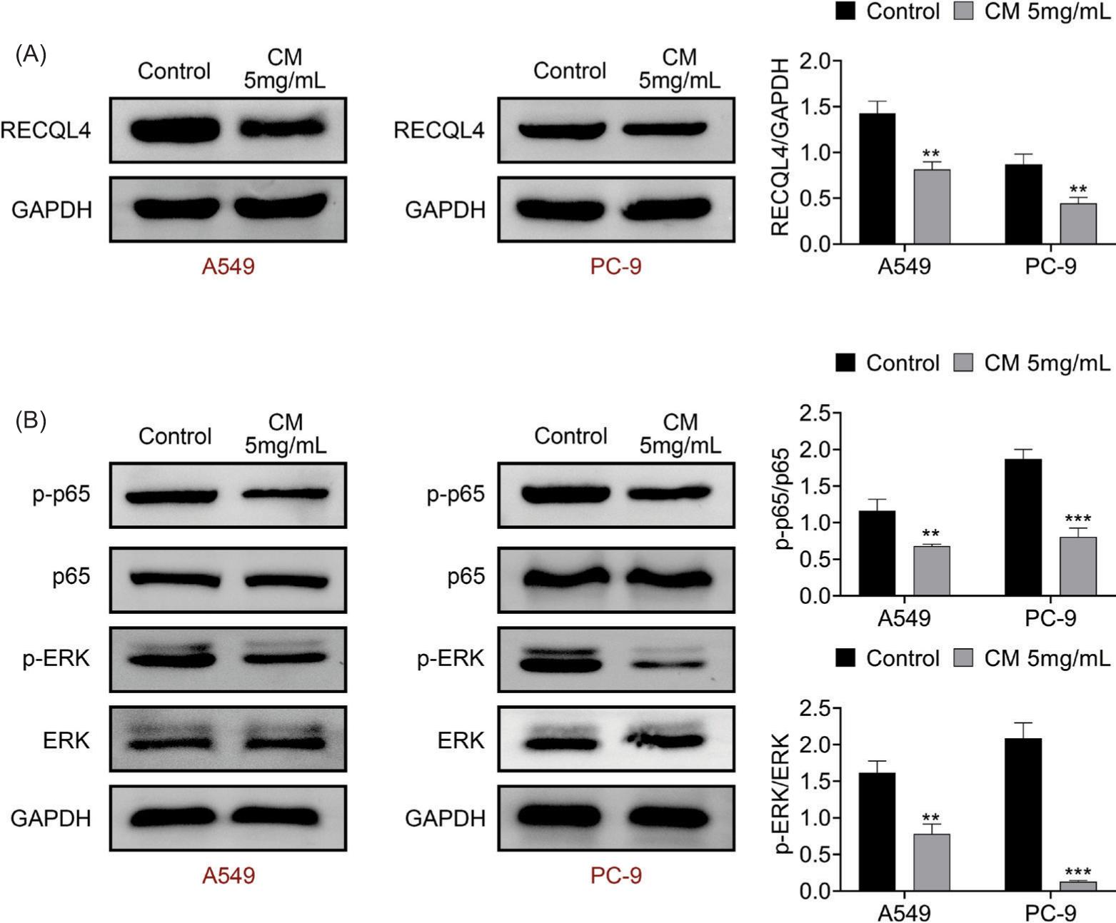 Figure 7 Cortex Mori extract blocked RECQL4-induced NF-κB and ERK signaling pathways. (A) The protein expression of RECQL4 was tested after CM (5 mg/mL) treatment through Western blot analysis. (B) The protein expressions of p-p65, p65, p-ERK, and ERK were examined after CM (5 mg/mL) treatment through Western blot analysis. **P < 0.01, ***P < 0.001 vs control.