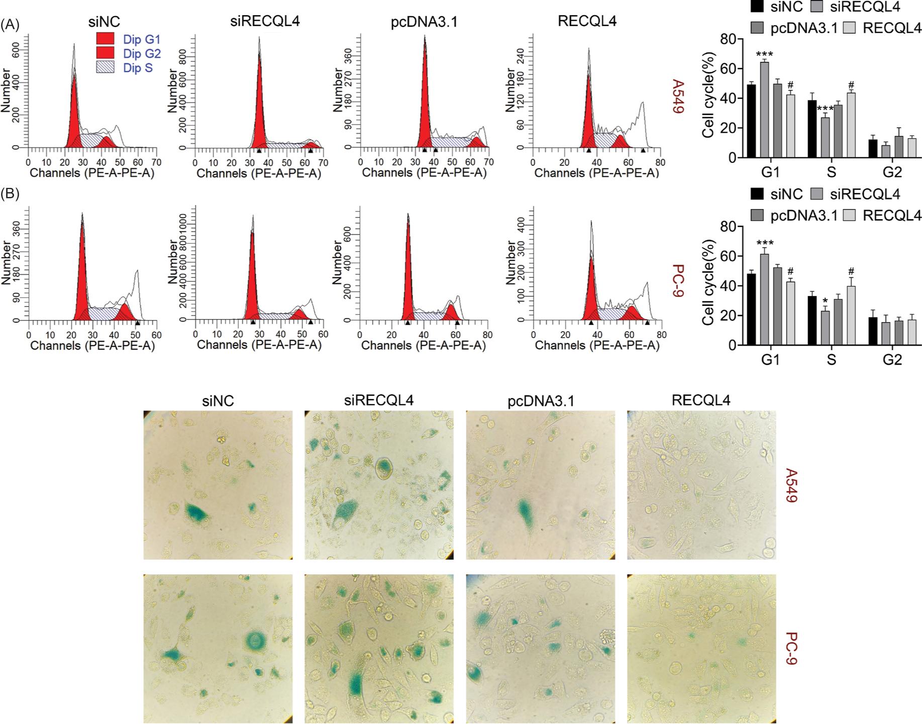Figure 4 RECQL4 relieved cell cycle arrest and cell senescence. (A) The cell cycle was evaluated after RECQL4 suppression or overexpression through flow cytometry. (B) The cell senescence was confirmed after RECQL4 down-regulation or up-regulation through SA-β-gal staining. *P < 0.05, ***P < 0.001 vs siNC; #P < 0.05 vs pcDNA3.1. NC: negative control.