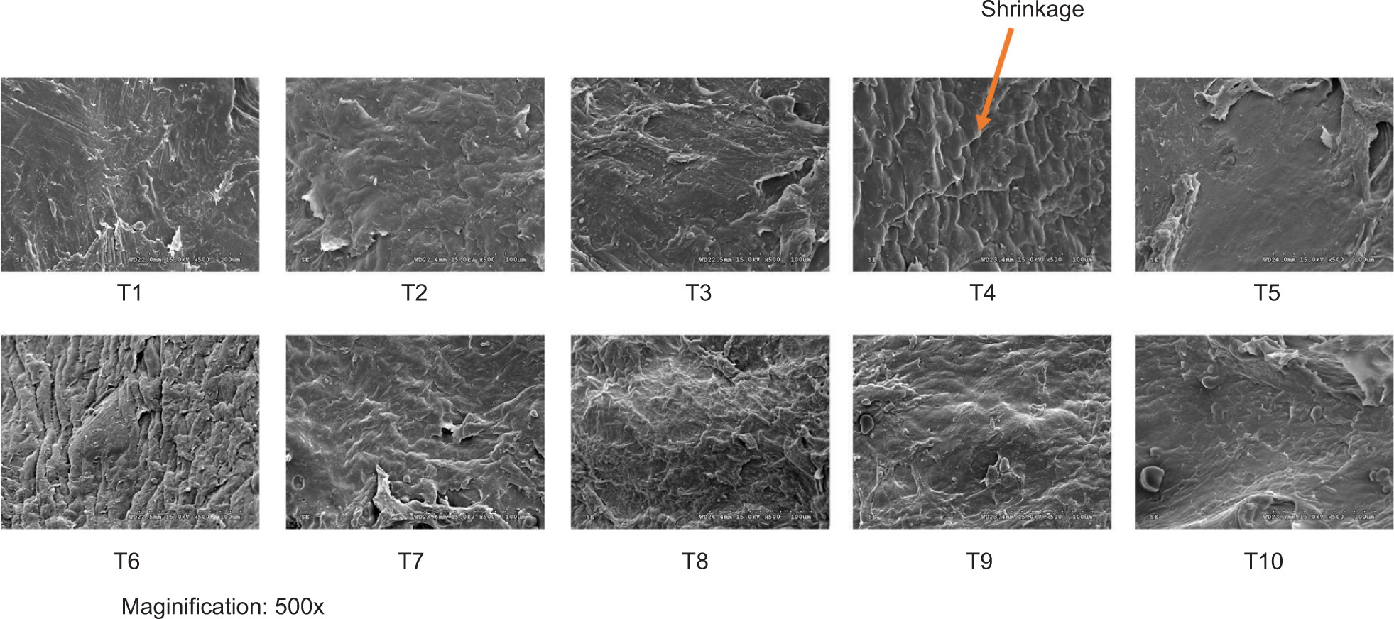 Die temperature and screw speed significantly affected the extent to which the peak breakage force of an extrudate was reduced. A higher expansion ratio and a lower bulk density are associated with declined hardness of extrudates (TN-JR). Melt viscosity is whittled down, and water vapor pressure is simultaneously increased with increase in die temperature and screw speed. The generation of air at the micro-structural cell level of an extrudate was stimulated by a rise in vapor pressure, forming a porous and brittle texture, thus lowering the hardness of TN-JR extrudate. Similar observations were stated by Gopirajah and Muthukumarappan (2018). Further, similar results were reported by Mohamad Mazlan et al. (2019), in which the hardness values of extrudates declined with an increase in temperature.