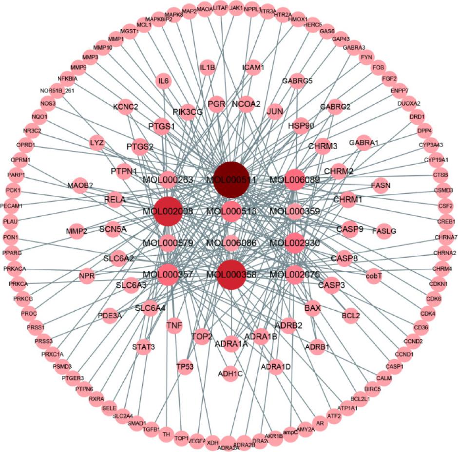 We used the Traditional Chinese Medicine System Pharmacology Database (TCMSP) database to search for the main active ingredients of SL and obtain main target genes for the action of active ingredients. Finally, we used the Cytoscape software platform (version 3.9.0) to visualize main active ingredients and their targets. The shades of color and the size of graphs were used to visualize connection between active ingredients and targets. The shades of color and the size of graphs were determined by the connectivity of active ingredients and target.