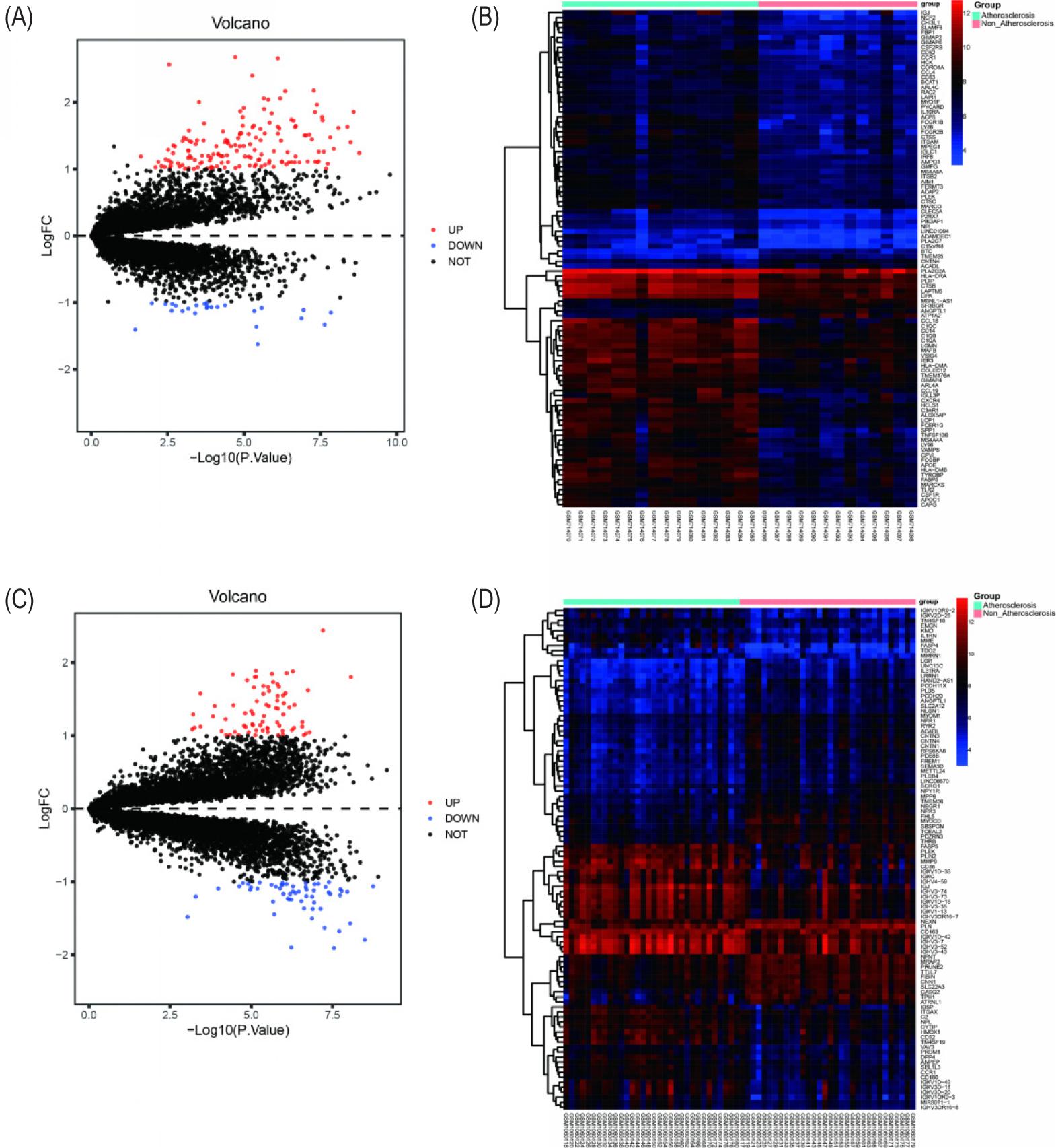 Atherosclerosis-related database was searched by DisGeNet and GENECARDs databases with the keyword “atherosclerosis” to obtain the therapeutic targets of AS. GSE28829 and GSE43292 data sets were obtained. In the GSE28829 dataset, 157 genes were up-regulated and 25 genes were down-regulated. In the GSE43292 dataset, 75 genes were up-regulated and 57 genes were down-regulated (Figure 2).