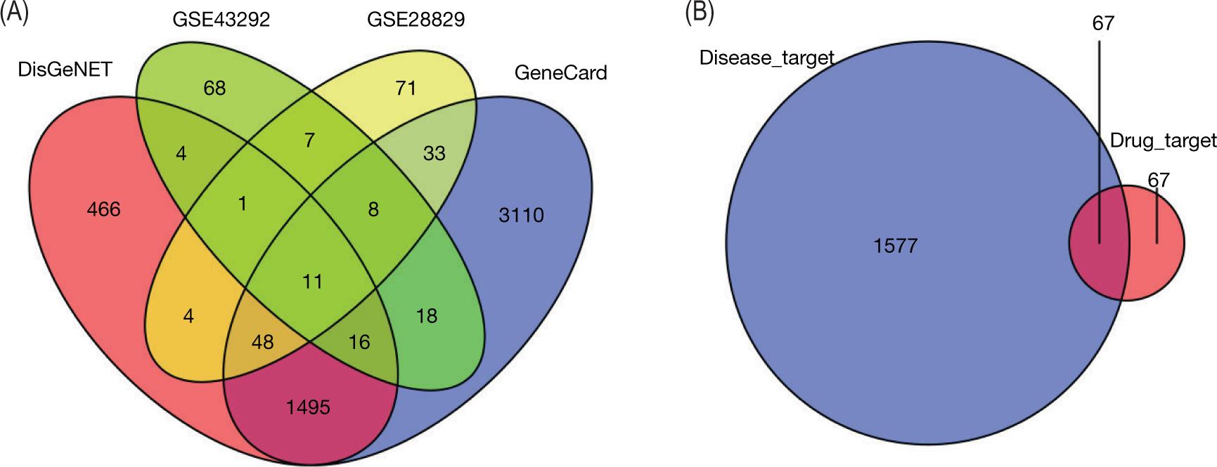 Figure 3. Targets associated with AS treatment. (A) Venn diagrams of AS treatment in two disease-databases and GEO dataset. (B) Venn diagrams of targets in at least two databases in (A) and SL treatment targets.