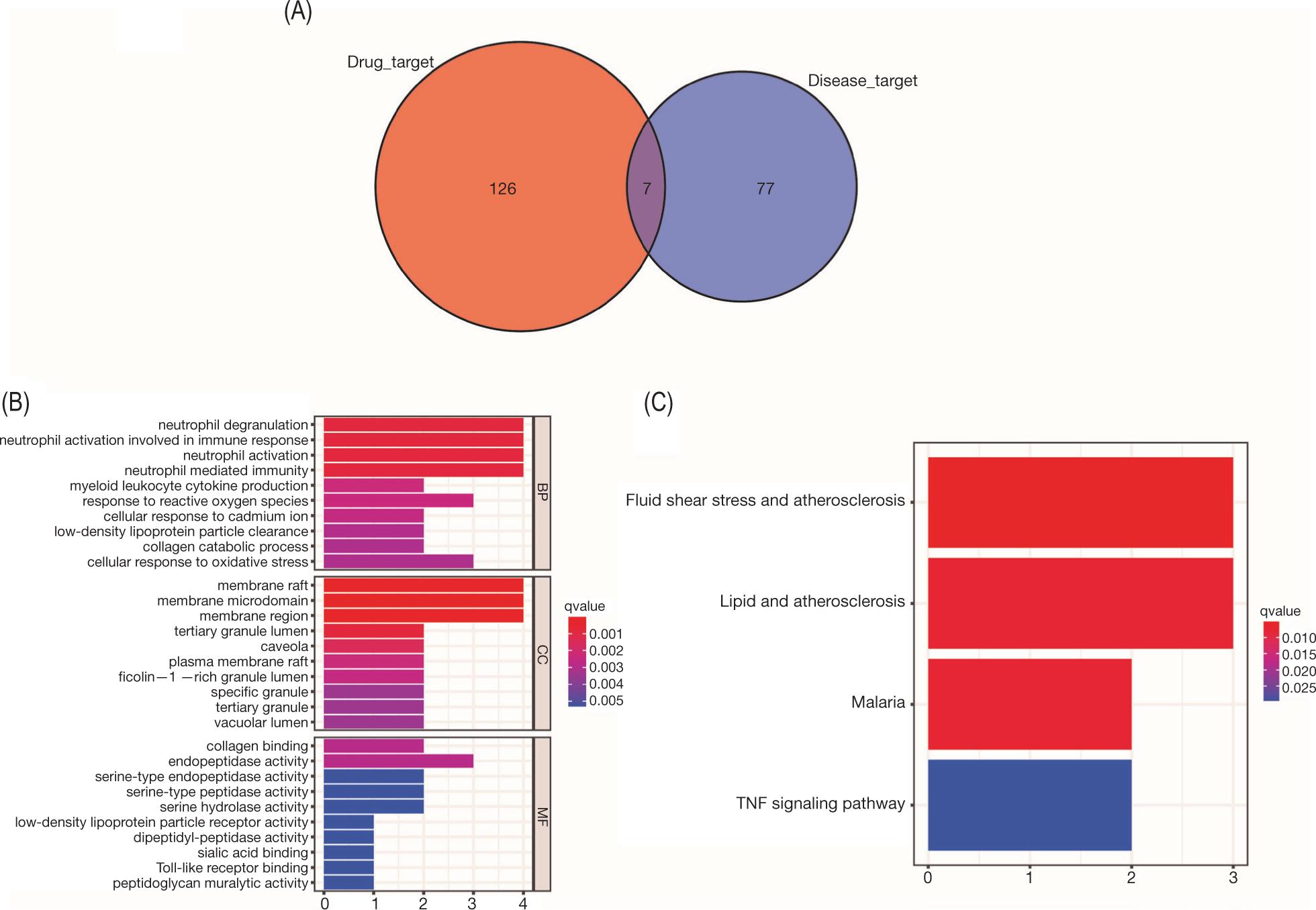 Figure 5. Enrichment analysis of three databases shows SL therapeutic targets. (A) Venn diagram of three databases and disease targets. (B) GO enrichment analysis [top 10 results for biological process (BP), cellular component (CC), and molecular function (MF) enrichment analysis]. (C) KEGG enrichment analysis of therapeutic targets (top 10 results).