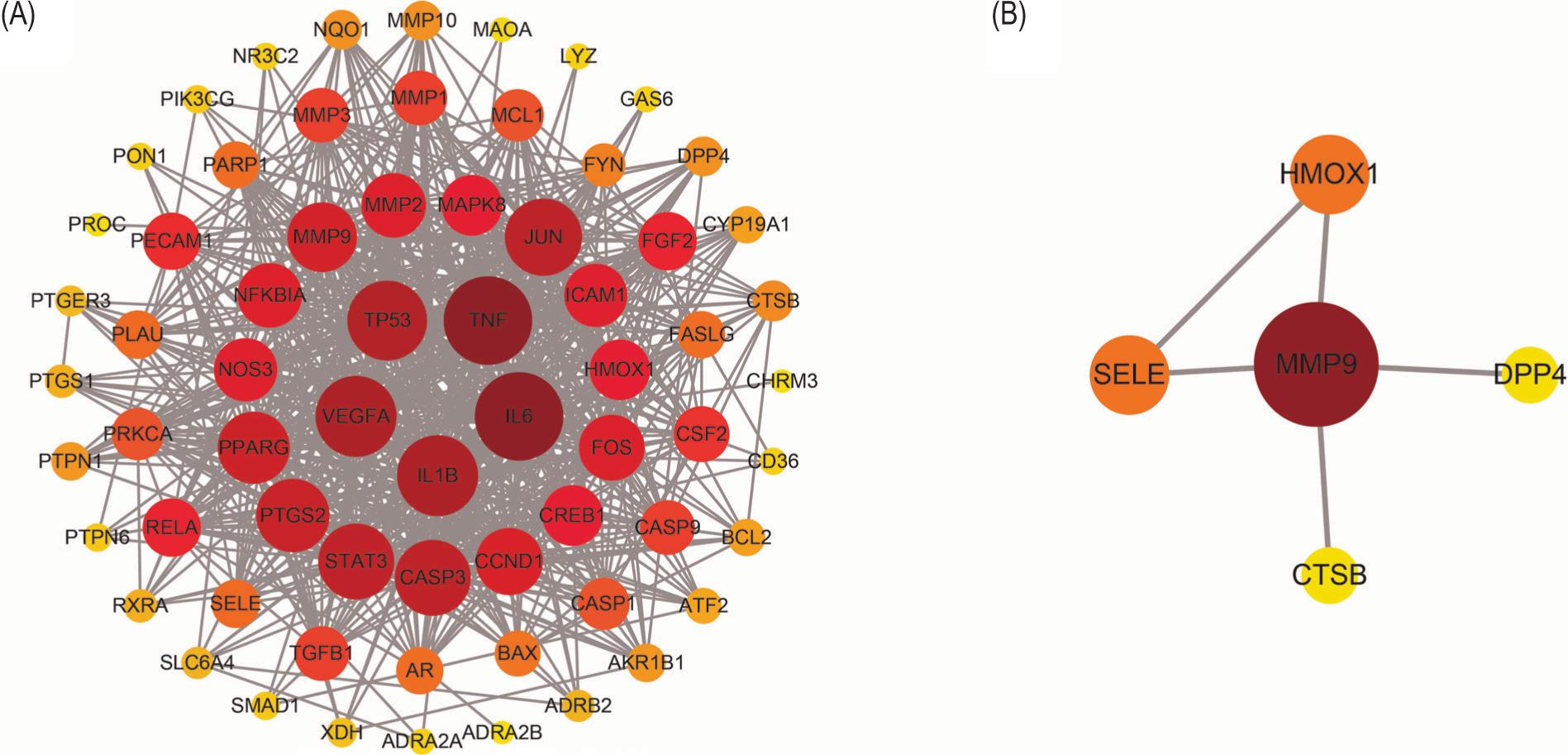 The targets of disease and SL were crossed to finally obtain 67 potential therapeutic targets of SL for AS, and five core targets with intersection in three databases; MMP9, SELE, HMOX1, DPP4, and CTSB were further screened. MMP9 plays an important role in the metabolism of extracellular matrix and collagen, and promotes smooth muscle migration to the subendothelium to form atheromatous plaques, thereby accelerating the progression of atherosclerotic plaque formation. It is also associated with plaque instability and rupture (Bakhshian et al., 2017; Rossano et al., 2014; Sierra et al., 2018). SELE encodes the protein present in cytokine-stimulated endothelial cells, and the current study showed that SELE had a key role in the development of AS, and targeting SELE would reduce atherosclerotic lesions, adverse cardiac remodeling, and dysfunction (Fereydouni et al., 2020; Tsoref et al., 2018).