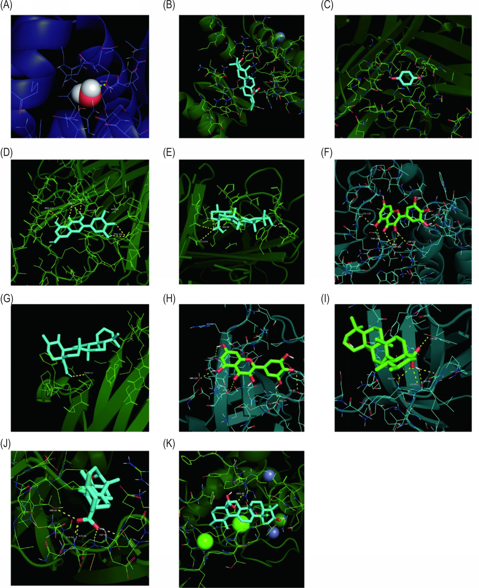 Figure 7. Results of the docking of core targets of PPI network with their corresponding active ingredient molecules. (A and B) p53 with 3,4,5-trihydroxybenzoic acid (gallic acid) and ursolic acid docking results. (C–E) Tumor necrosis factor (TNF) with hydroquinone, myricetin, and ursolic acid docking results. (F and G) Docking results of IL-6 with myricetin and ursolic acid. (H and I) Docking results of IL-1B with myricetin and ursolic acid. (J) Docking results of VEGFA with ursolic acid. (K) Docking results of MMP9 with ursolic acid.