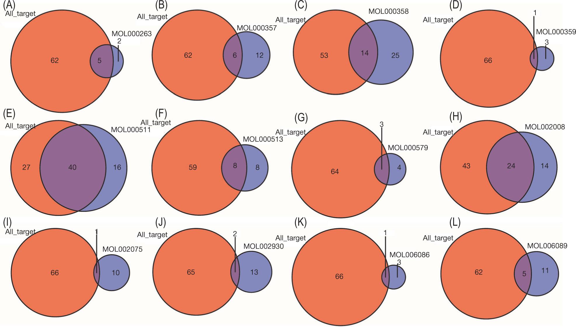 Figure 8. Intersection of active ingredients of SL with AS therapeutic targets. (A) MOL000263. (B) MOL000357. (C) MOL000358. (D) MOL000359. (E) MOL000511. (F) MOL000513. (G) MOL000579. (H) MOL002008. (I) MOL002075. (J) MOL002930. (K) MOL006086. (L) MOL006089.
