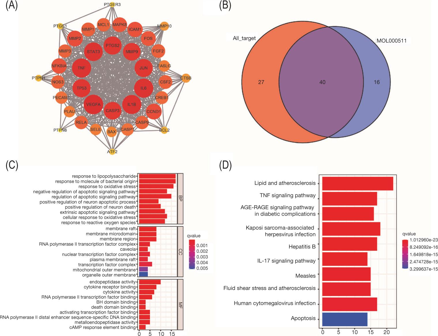 We obtained the target genes associated with Jing tian Panax notoginseng for AS treatment, and to reveal the functions of the target genes, we performed GO annotation and KEGG pathway enrichment analysis using the R package clusterProfiler. GO terms consisted of the following: biological process (BP), cellular component (CC), and molecular function (MF); q < 0.05 was considered as statistically significant. The target genes were imported into the Search Tool for the Retrieval of Interacting Genes (STRING) database (https://string-db.org/) to construct a functional PPI network. Interaction score > 0.4 was fixed. Finally, we used Cytoscape (version 3.9.0) to visualize main active ingredients and their targets of action, with the shade of color and the size of the graph determined by the connectivity of active ingredients and the targets of action.