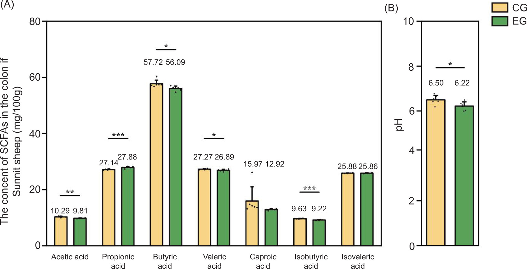 Figure 1. Effects of exercise on the content of SCFAs in the colon of Sunit lamb (mg/100 g). CG: control group (basal feed), EF: exercise group (basal feed + exercise). *Significant difference between the two groups (P < 0.05); **significant difference between the two groups (P < 0.01); ***significant difference between the two groups (P < 0.001). (A) The content of SCFAs (mg/100 g) between both CG and EG groups; (B) difference in pH value between both CG and EG groups. SCFAs: short-chain fatty acids.