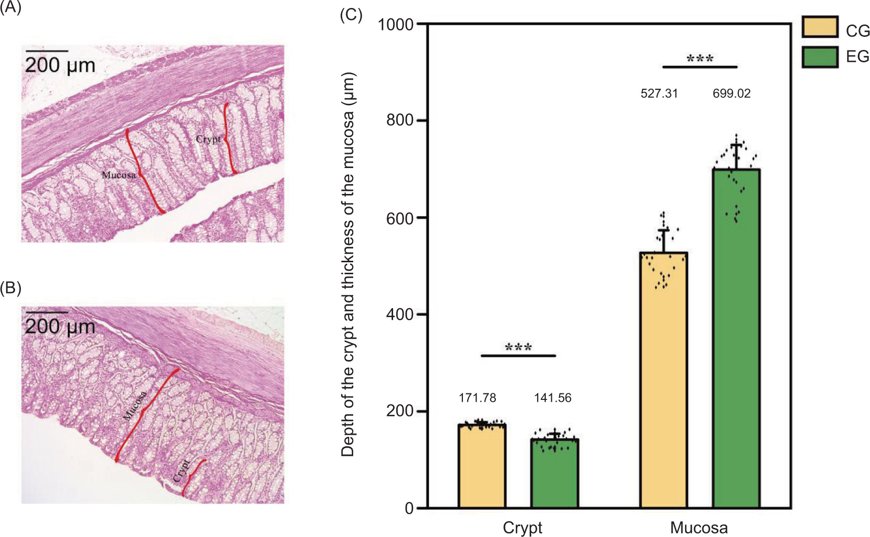 Figure 2. Effects of exercise on the colon structure of Sunit lamb. CG: control group (basal feed), EG: exercise group (basal feed + exercise). ***Significant difference between the two groups (P < 0.001). (A) Colonic structure of lamb in the captive group; (B) colonic structure of lamb in EG; (C) differences in the crypt and mucosa in the intestinal structure of both CG and EG groups.