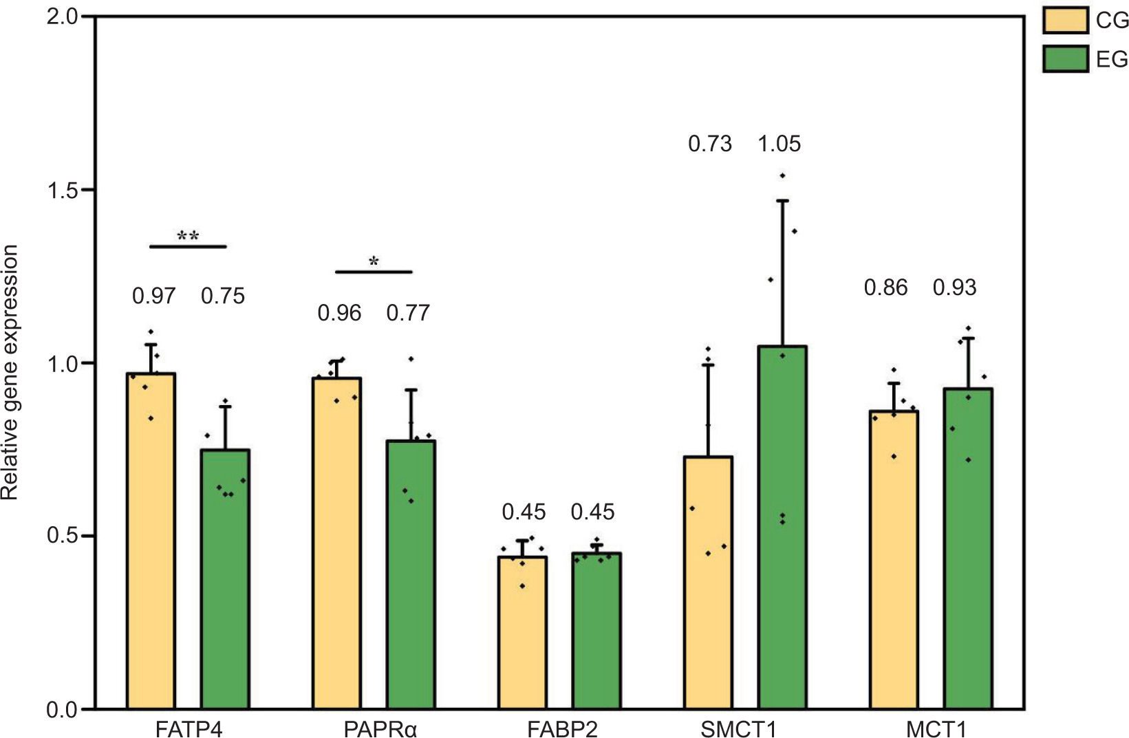 Figure 3. Effects of exercise on the expression of a fatty acid absorption transporter gene in the colon of Sunit lamb. CG: control group (basal feed), EF: exercise group (basal feed + exercise). *Significant difference between the two groups (P < 0.05); **significant difference between the two groups (P < 0.01).