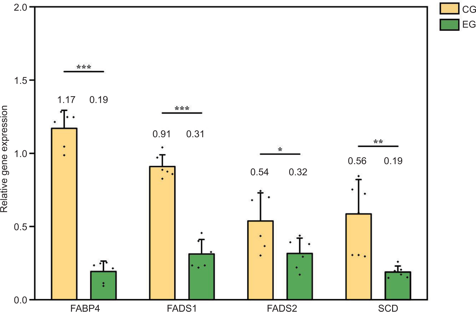 Figure 4. Effects of exercise on gene expression of fatty acid metabolism in the longissimus dorsi muscle of Sunit lamb. CG: control group (basal feed), EG: exercise group (basal feed + exercise). *Significant difference between the two groups (P < 0.05); **significant difference between the two groups (P < 0.01); and ***significant difference between the two groups (P < 0.001).