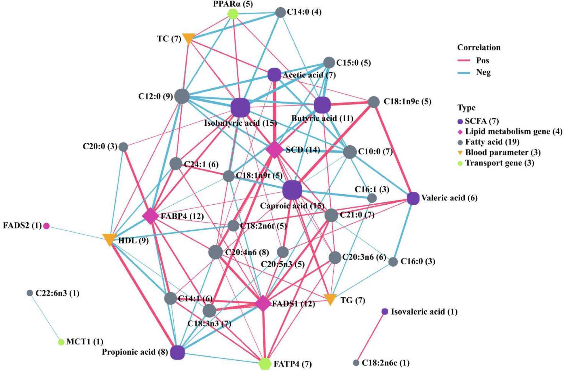 Figure 5. Correlation analysis of SCFAs, fatty acid absorption and transport genes, lipid metabolism genes, blood parameters, and fatty acids. Correlations were analysed using Spearman’s correlation. Only correlations with |Spearman’s r| > 0.6 and P < 0.05 were retained and presented in the figure. Size of the dots in the graphs indicates the number of indicators associated with them (numbers in parentheses), and the shape and colour of the dots indicate their type. The thickness of the line indicates the magnitude of |Spearman’s r|: the thicker the line, the larger the |Spearman’s r|. Line colour indicates the positivity or negativity of Spearman’s r. Red line indicates a positive correlation between the two indicators in case Spearman’s r > 0, while a blue line indicates a negative correlation if Spearman’s r < 0.
