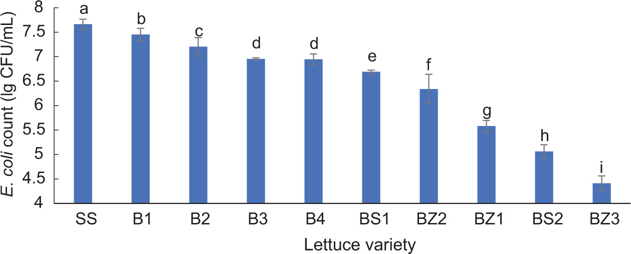 Figure 1. Escherichia coli count results from different varieties of lettuce juice. Different letters in the figure indicate significant differences (P < 0.05).