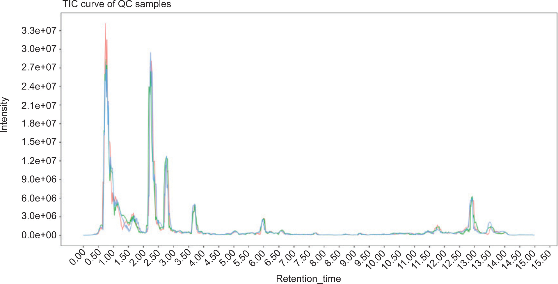 Quality control samples were used to evaluate the stability and repeatability of the system during the test. As illustrated in Figure 2, results showed that the curves of the total ion current for metabolite detection had a high overlap, that is, the retention time and peak intensity were consistent, indicating that the signal stability was better when the mass spectrometer detected the same sample at different times.