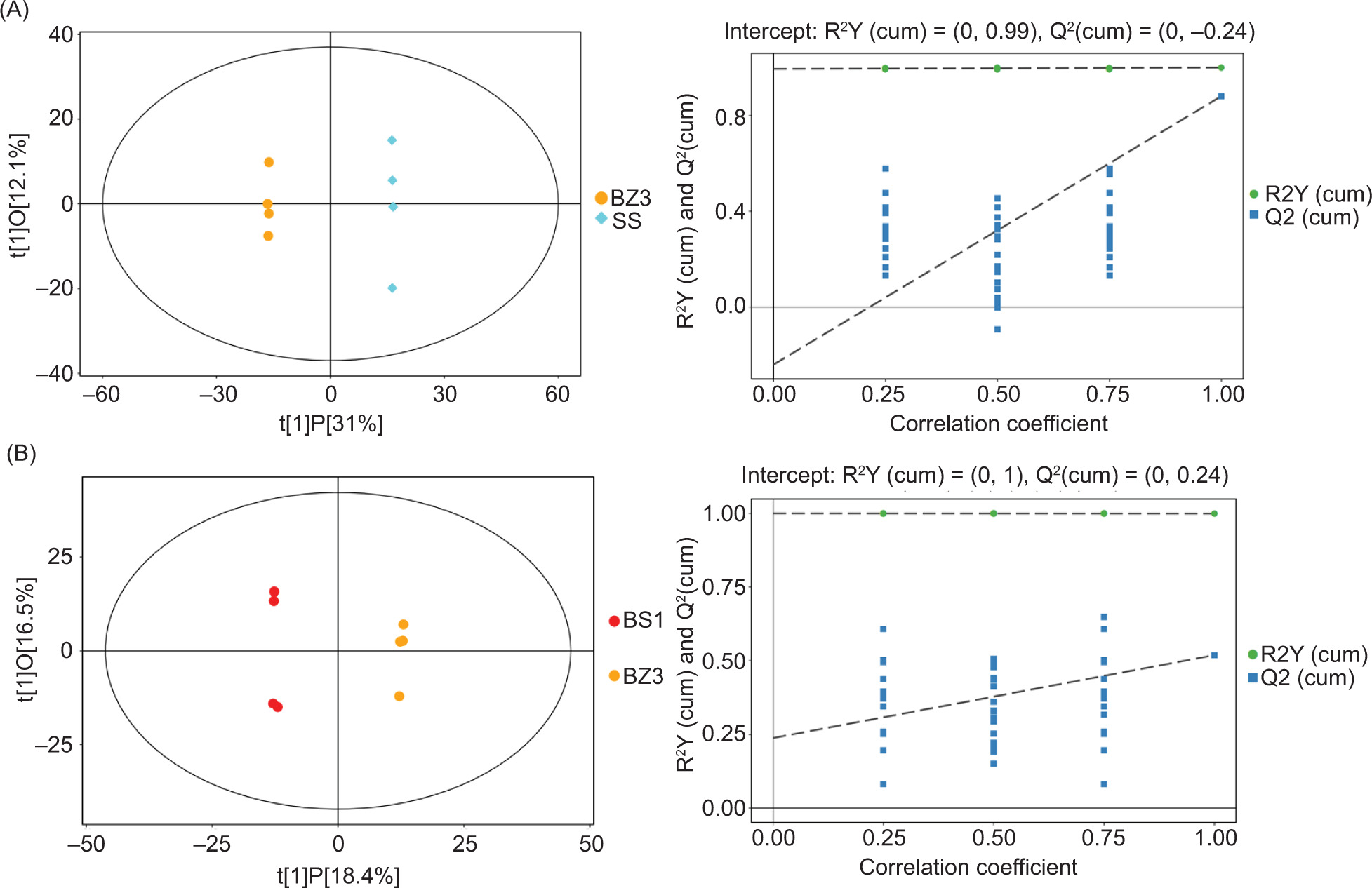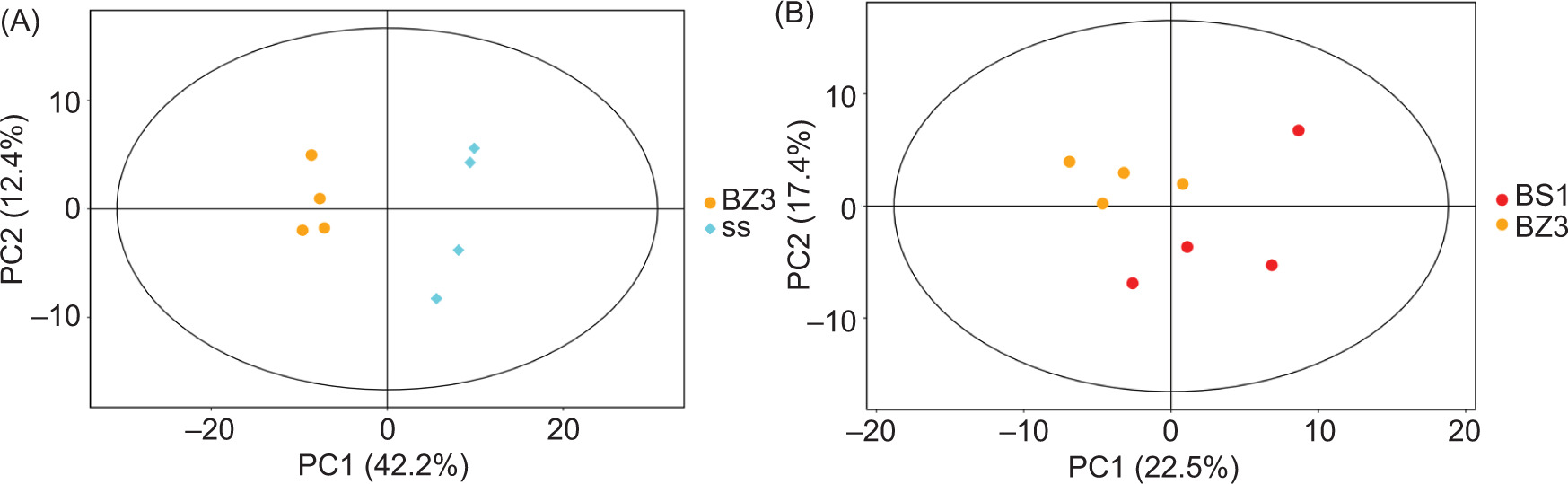 The PCA modeling method was used for the analysis because the antibacterial activities of BZ3 and SS were very different: when principal component (PC) 1 was 42.2%, PC2 was 12.4%, and BZ3 and SS could clearly be separated as having differences in metabolites. However, due to the small differences in antibacterial activity of BZ3 and BS1 with those of BZ3 and SS, the differences in metabolites of the former duo were smaller.