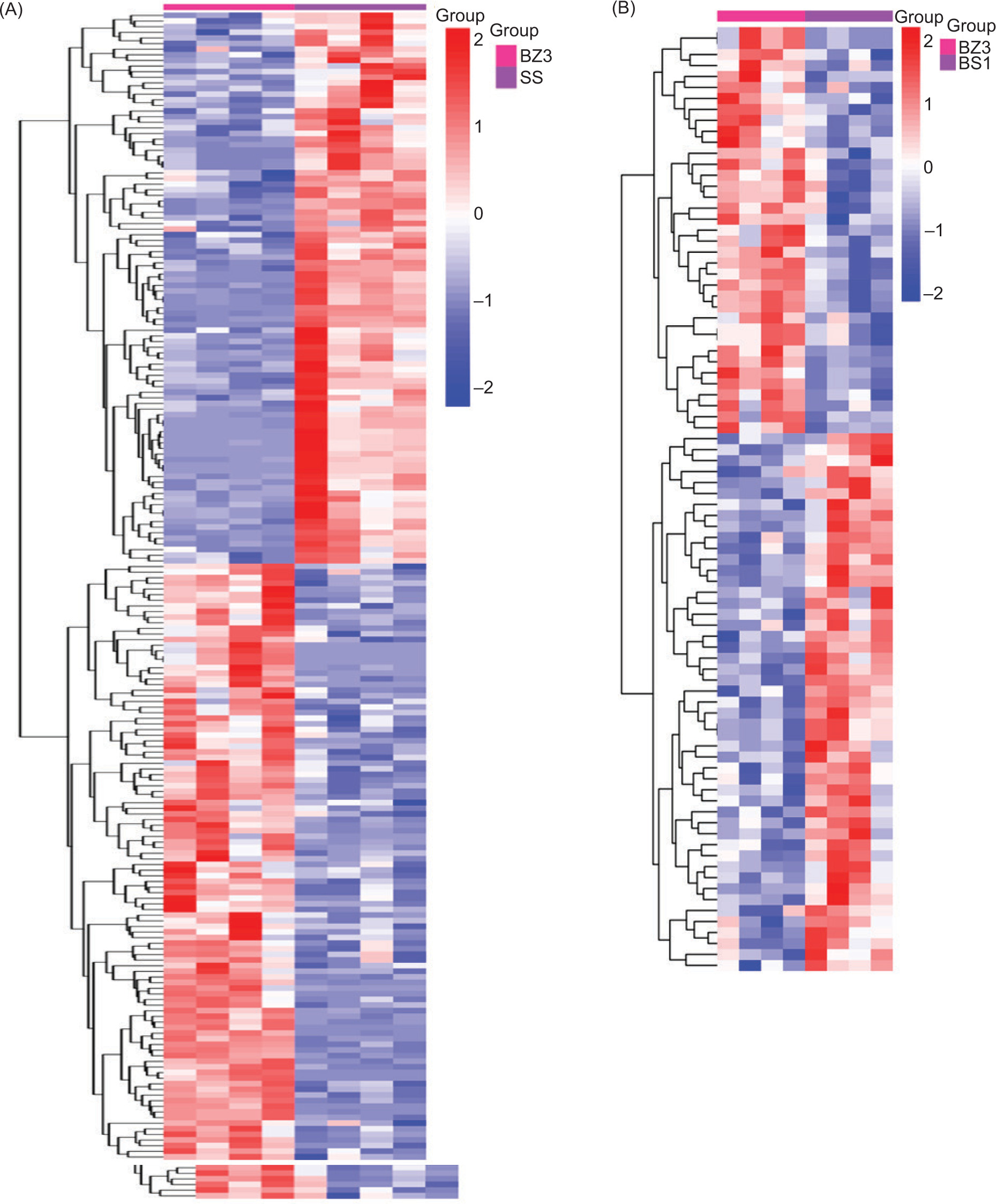 Figure 6. Heatmap of the hierarchical clustering analysis for differential metabolites. Group A is BZ3 versus SS; group B is BZ3 versus BS1. The color indicates the content: red indicates high expression, and blue indicates low expression.