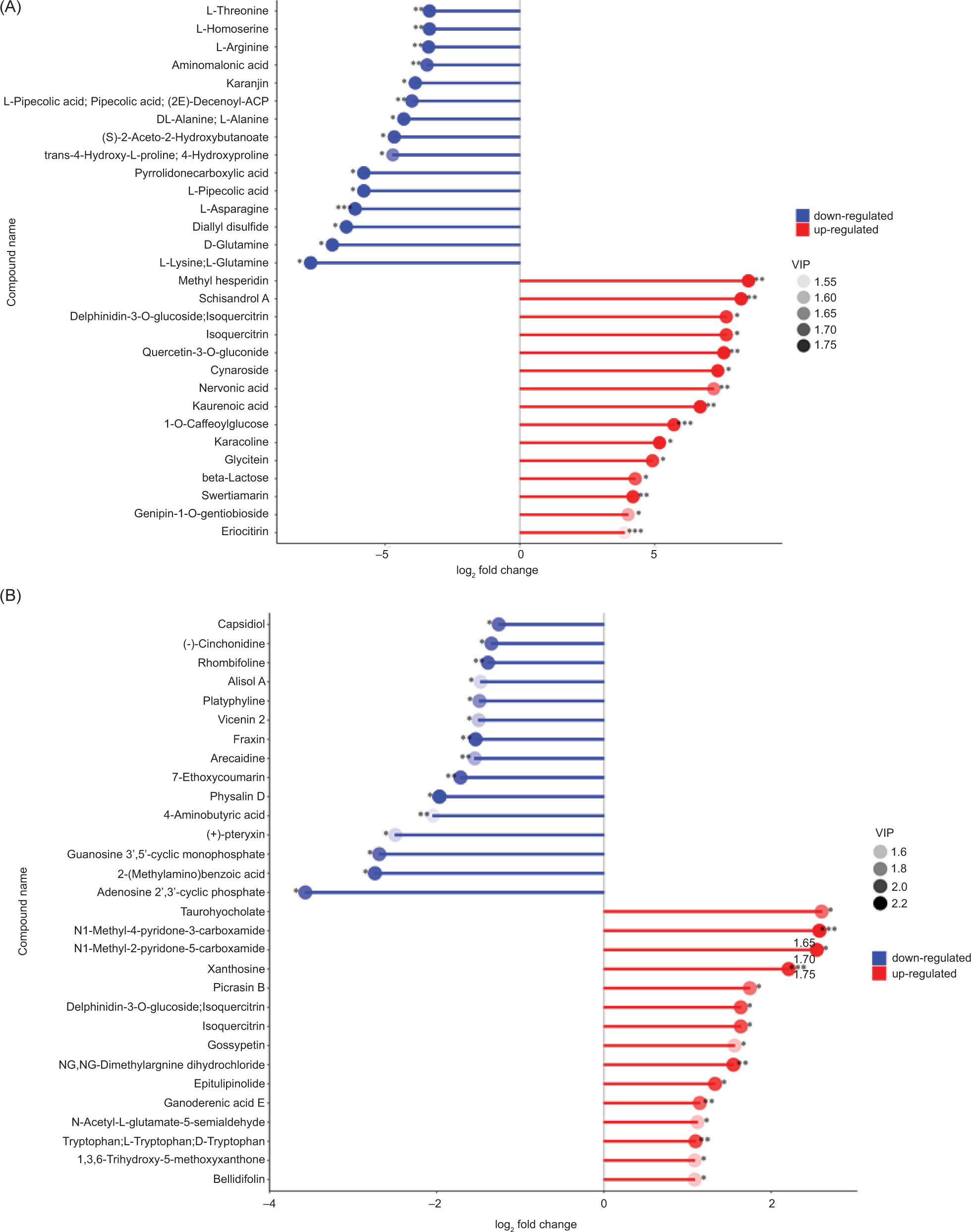 Figure 7. Matchstick analysis for significantly different metabolites. Group A is BZ3 versus SS; group B is BZ3 versus BS1. The abscissa shows the multiples of change after logarithmic transformation, and the shades of the dots represent the variable importance in projection (VIP) value. An asterisk (*) represents significance: *0.01 < P < 0.05, **0.001 < P < 0.01, ***P < 0.001.