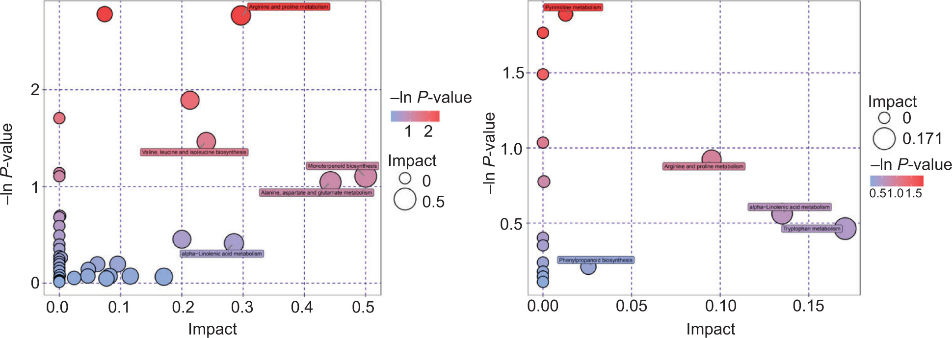 Figure 8. Pathway analysis for the two groups. Group A is BZ3 versus SS; group B is BZ3 versus BS1. Each bubble in the bubble chart represents a metabolic pathway. The abscissa of the bubble and the size of the bubble indicate the size of the enrichment and size of the influence factor of the pathway in the topology analysis. The larger the value, the greater the impact factor. The ordinate of the bubble and the bubble color indicate the P-value of the enrichment analysis (by taking the negative natural logarithm, i.e., −ln(p)). The darker the color, the smaller the P-value and the more significant the degree of enrichment.