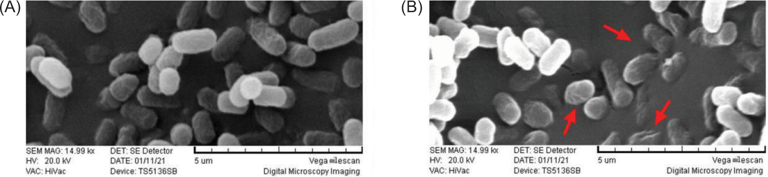 The micromorphology of E. coli in the control group and the lettuce polyphenol extract treatment group is shown in Figure 9. The morphology of E. coli in the control group (A) showed a complete and smooth rod-like structure. Upon introduction of lettuce polyphenol extract (B), there was a reduction of approximately 25% in the average bacterial length. Furthermore, the bacterial surface exhibited a rough and incomplete morphology, while the cellular surface was markedly depressed and wrinkled. The overall morphology of the bacteria was compromised, leading to cell disruptions and dissolution of their contents.