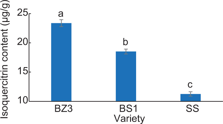 The isoquercetin content in different varieties of lettuce was determined. There was a significant difference in its content in BZ3, BS1, and SS (P < 0.05), with BZ3 having the highest content, at 23.38 μg/g, and SS the lowest (11.26 μg/g). The content of BS1 fell in between the two (18.52 μg/g).