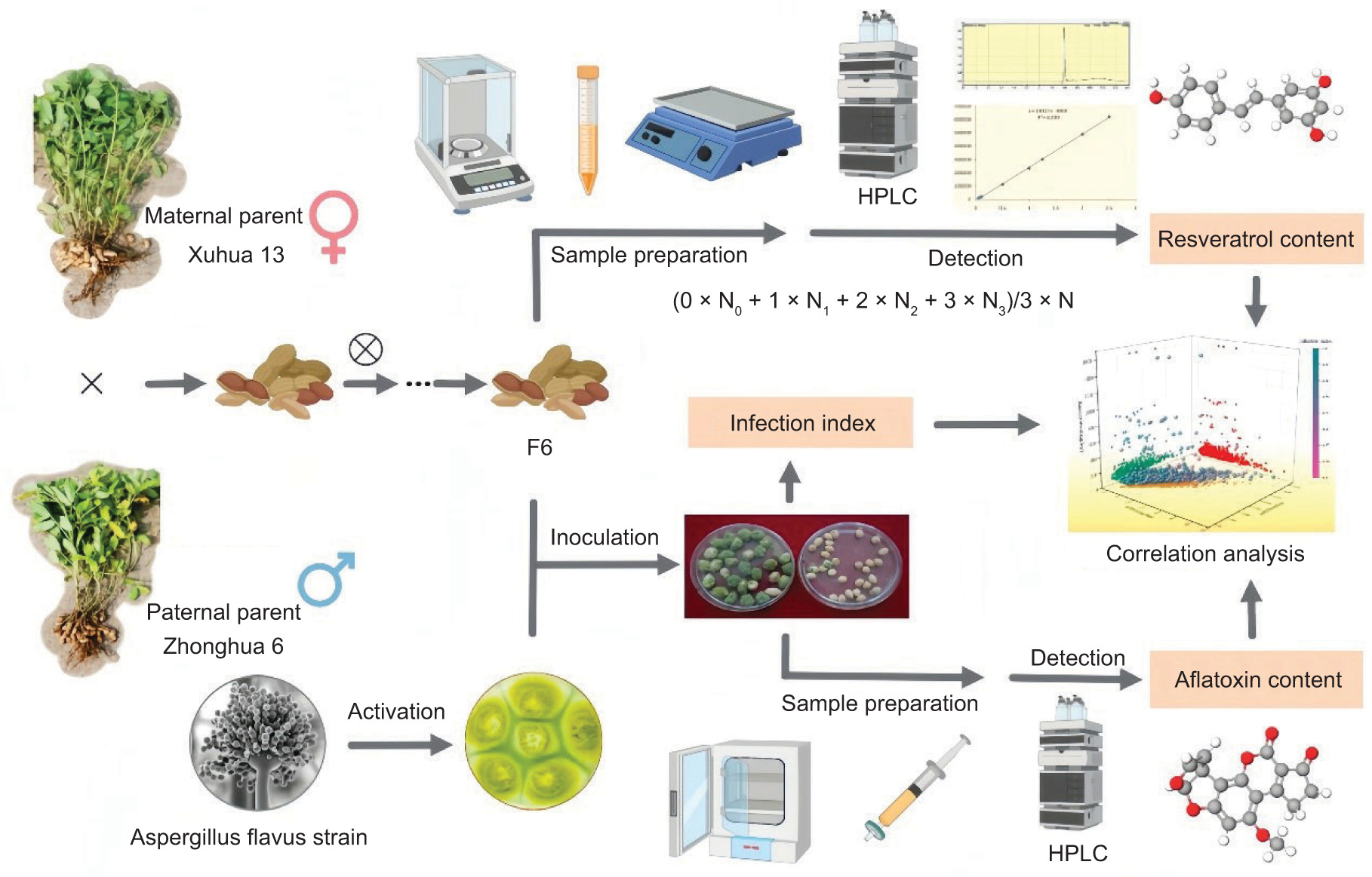 In this study, we investigated the genetic distribution of peanut resveratrol and its impact on resistance against aflatoxin contamination. The peanut variety Xuhua 13 was selected as the maternal parent (P1), while Zhonghua 6 was chosen as the paternal parent (P2) (Yu et al., 2023). A total of 240 lines from its F6-generation recombinant inbred line population were used as experimental materials to analyze the resveratrol content in P1, P2, and F6. Additionally, the distribution of peanut resveratrol content in the recombinant inbred line population was investigated. We examined aflatoxin production and infection index in peanuts inoculated with Aspergillus flavus at different levels of resveratrol content. This work could provide useful information on resistance to aflatoxin contamination (Figure 1).
