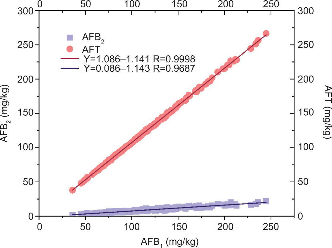 AFB1 exhibited a positive correlation with AFT (correlation coefficient = 0.9998). A significant positive correlation was also found between AFB1 and AFB2 (correlation coefficient = 0.9687) (Figure 2).