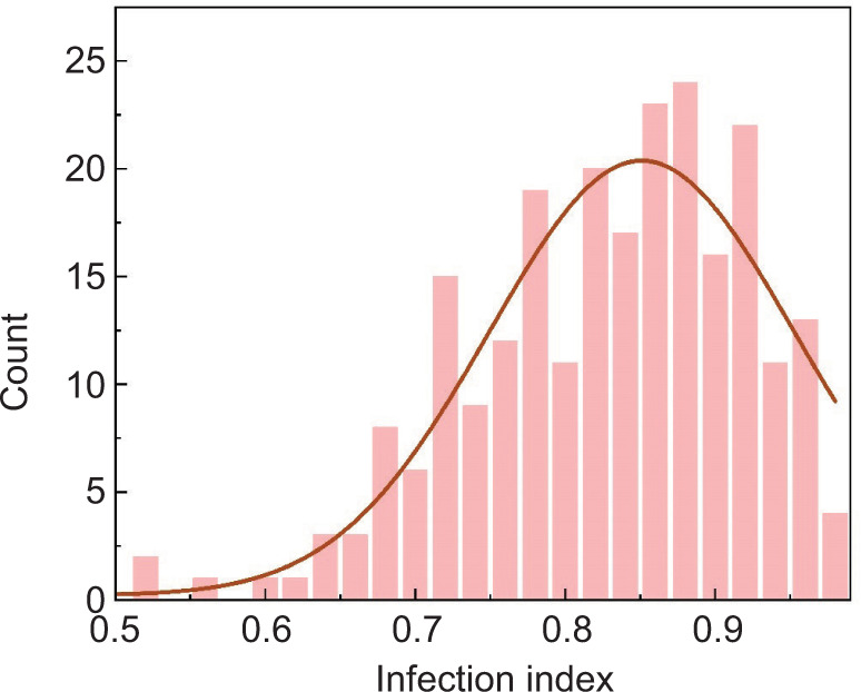 The infection index is a metric utilized to assess the severity of plant diseases, indicating the level of pathogen infection in plants. Certain peanut varieties exhibit strong disease resistance, which helps reduce the infection index by preventing pathogen attacks. Conversely, peanut varieties with low disease resistance are more vulnerable to disease infections, leading to a higher infection index. The infection index of the Xuhua 13 variety inoculated with AF2202 (0.91) was higher than that of the Zhonghua 6 variety (0.89). Among the 240 recombinant inbred populations, the infection index varied from 0.52 to 0.98, with significance values (5%, 50%, and 95%) and average values at 0.68, 0.84, 0.96, and 0.83, respectively (Table 1). The distribution of the infection index exhibited a left-skewed pattern (Figure 3).