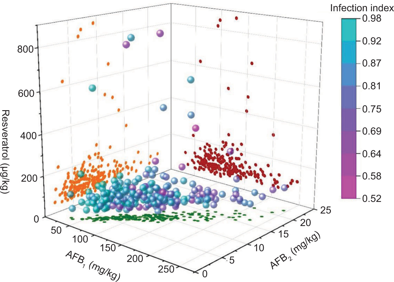 Table 1. Distribution of resveratrol and AFB1, AFB2, AFT and infection index in peanut.