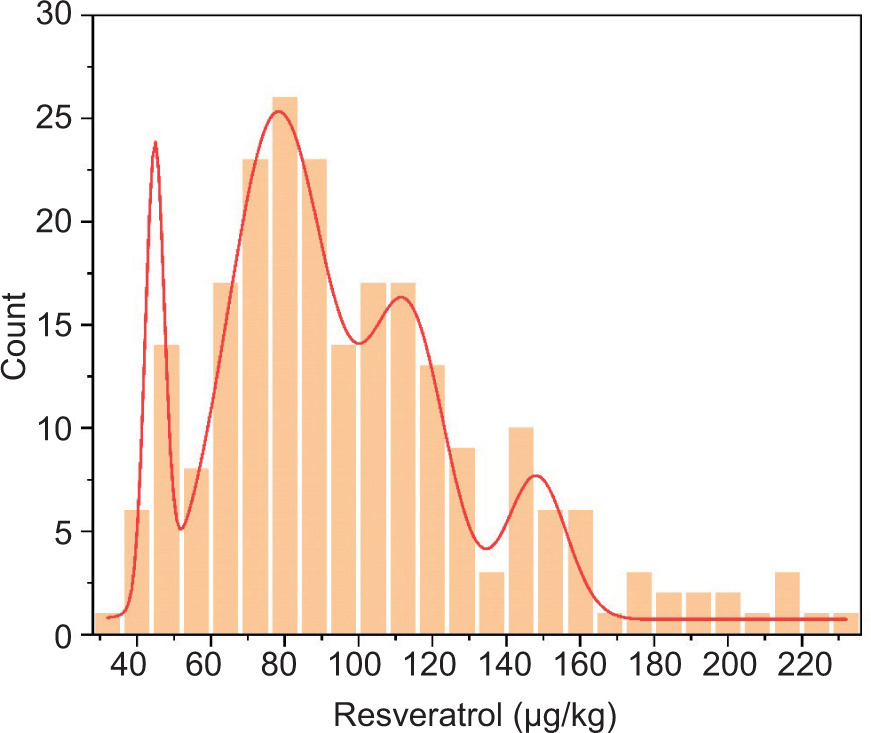 In the F6 recombinant inbreeding population, 3 individuals had lower resveratrol contents than the maternal Xuhua 13 variety (44 µg/kg). A total of 155 individuals showed intermediate contents between those of their parent varieties, and 82 individuals displayed higher resveratrol contents than that of the paternal Zhonghua 6 variety (116 µg/kg). The highest resveratrol level reached 867.0 µg/kg, which was 7.5 times greater than that in its father and 20 times more abundant than in its mother.