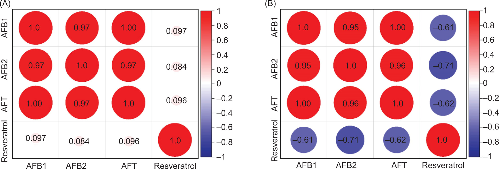 Figure 6. The correlation between the content of resveratrol and AFB1, AFB2, and AFT [(A) Fell below 300 μg/kg; (B) Exceeded 300 μg/kg].