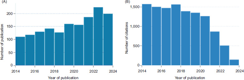 Figure 1. (A) Number of publications and (B) citations of E. sativa, mass spectrometry, and health benefits between 2014 and 2024. Source: www.lens.org. Accessed on 26 June 2024.