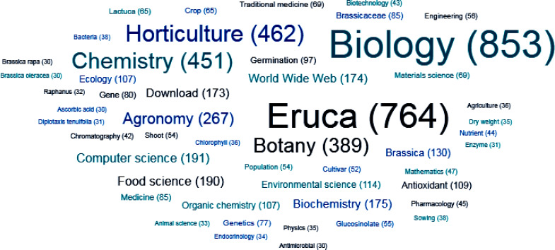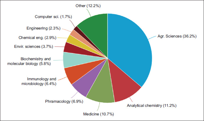 From the utilized 876 publications, at least 87.8% were explicitly about E. sativa, MS, and medicinal potential. The research areas were evaluated according to the Journal Citation Report (JCR) assignments. The most allocated JCR subject category was (i) agricultural sciences, (ii) analytical chemistry, and (iii) medicine and pharmacology, with 65% of the total of topics (Figure 2). The increasing attention to E. sativa in medicine is linked to various factors, such as beneficial impact on various diseases (e.g. antiulcer, anticancer, antioxidant, antimicrobial, anti-obesity, and hypoglycemic activities, and cardiovascular and neuroprotective benefits) as well as their phytochemical characterization by suitable analytical chemistry tools (such as MS measurements).