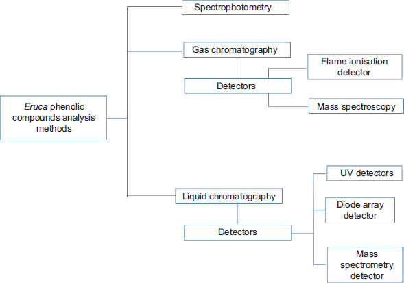 Fagerlund et al. (2021) examined anti-listerial activity in E. sativa, and concluded that the active fraction was retained in polar chromatographic conditions and comprised several metabolites. The elucidation of this fraction, using LC-MS/MS, led to identification of compounds containing 19 nucleosides and amino acids: 11 amino acids, a dipeptide, a quaternary ammonium compound, an amine, three nucleosides, and two nucleobases. In summary, Table 2 presents some frequently used methods to quantify and identify phenolic compounds (chromatographic conditions; mobile phase and gradient; quantification and detection; and analytical method) from different extracts of Eruca species. As shown in Figure 4, many dependable quali-quantitative approaches are available for the measurement and characterization of phenolic contents/compounds from Eruca species.