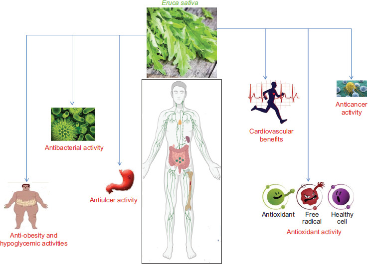 The use of medicinal plants to treat human ailments has received more attention recently. Eruca sativa (E. sativa; jarjeer) is a very popular edible plant of the Brassicaceae family with remarkable nutritional and therapeutic properties. In this frame, bioactive metabolites derived from E. sativa biomass have captured more attention in pharmacotherapy and biomedicine. This review focuses on recent advances in high-resolution mass spectrometry (HRMS), which have made the characterization of Eruca metabolites, such as glucosinolates and their derivatives, more feasible. Moreover, bio-pharmacological impact, viz. antiulcer, anticancer, antioxidant and antimicrobial, anti-obesity and hypoglycemic activities, cardiovascular benefits, and neuroprotective effects are discussed. This review concentrates all important research findings on these topics, and stresses upon the activities of chemistry and pharmacological areas. By stressing upon additional investigations, this paper emphasizes and appeals researchers and industrials to attempt a comprehensive knowledge of the pharmacological implications of Eruca species and improve their application in modern medicine.