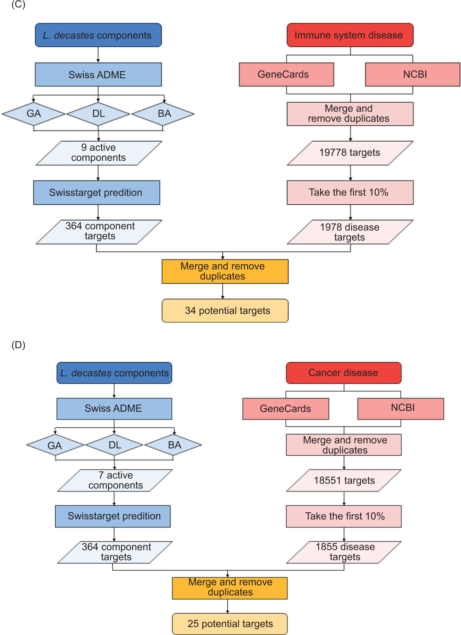 Figure 2. Flow chart for the prediction of targets of active components from fungi and diseases by network pharmacological analysis. (C) active components of L. decastes and ISD; and (D) active components of L. decastes and CD.