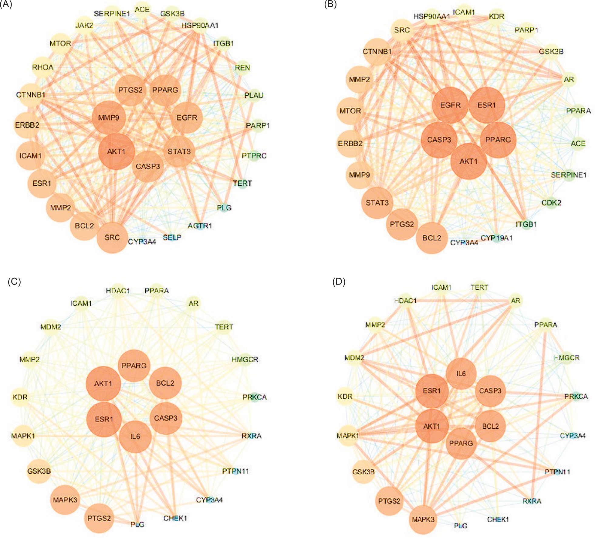 Figure 3. Interaction network diagram of core pharmacodynamic targets of fungi components for treating diseases. (A) L. edodes components and ISD; (B) L. edodes components and CD; (C) L. decastes components and ISD; and (D) L. decastes components and CD.