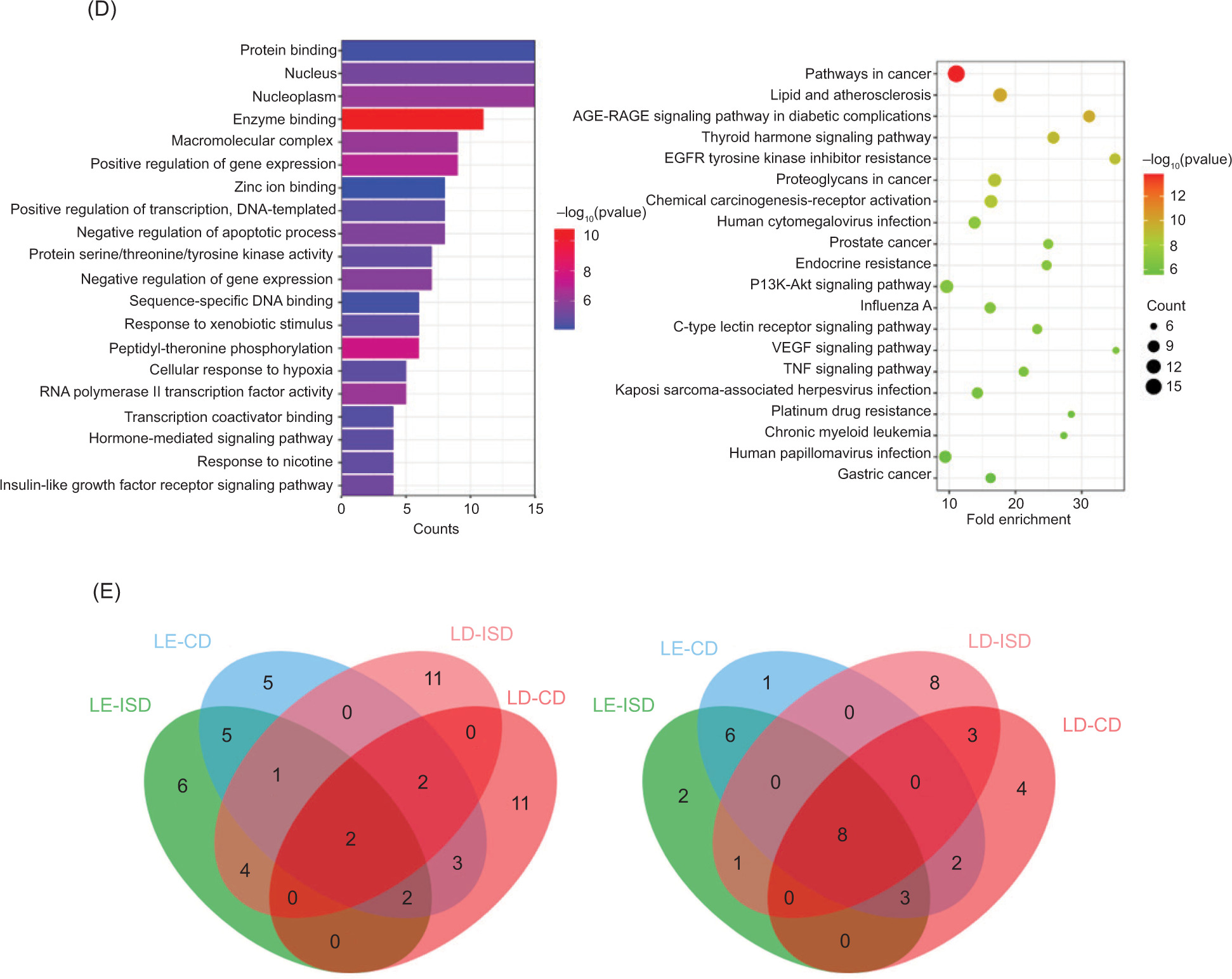 Figure 4. The GO and KEGG enrichment analysis of core pharmacodynamic targets. (D) L. decastes components and CD; and (E) Venn diagram of the results of enrichment analysis of the intersection of components and diseases. The results of GO analysis are on the left and that of KEGG analysis on the right.