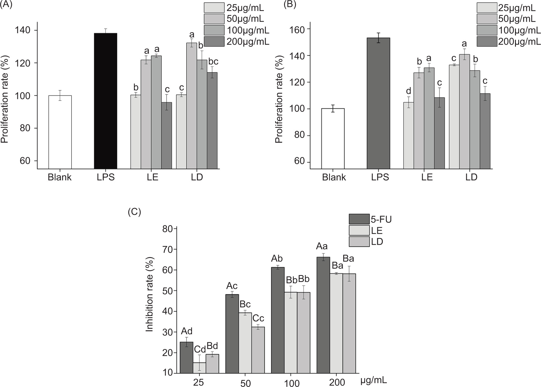 Figure 6. Changes in the activity of different cells after edible fungi treatment. (A) Changes in RAW264.7 proliferation rate; (B) changes in RAW264.7 phagocytosis rate and (C) changes in HepG-2 inhibition rate. Lowercase letters represent significant differences between different concentrations in the same group, and uppercase letters represent significant differences between different groups at the same concentration (n = 6, P < 0.05).