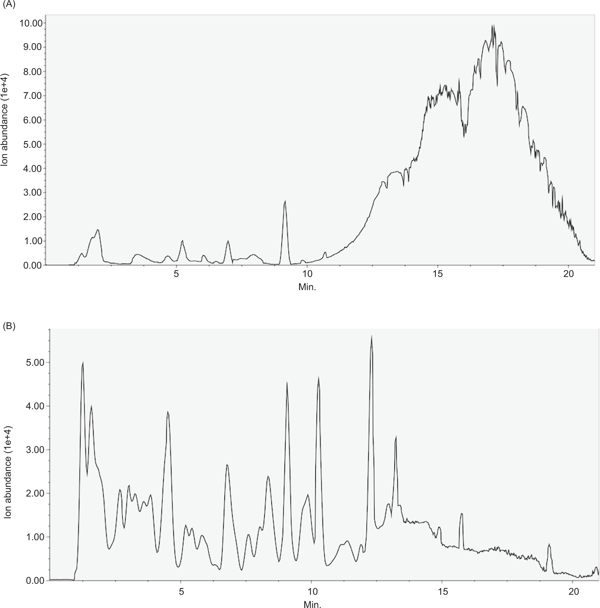 Figure S1. Full-scan ion abundance profile chromatogram in different ion modes of L. edodes and L. decastes. (A) Positive ion mode chromatogram of L. edodes, (B) negative ion mode chromatogram of L. edodes.