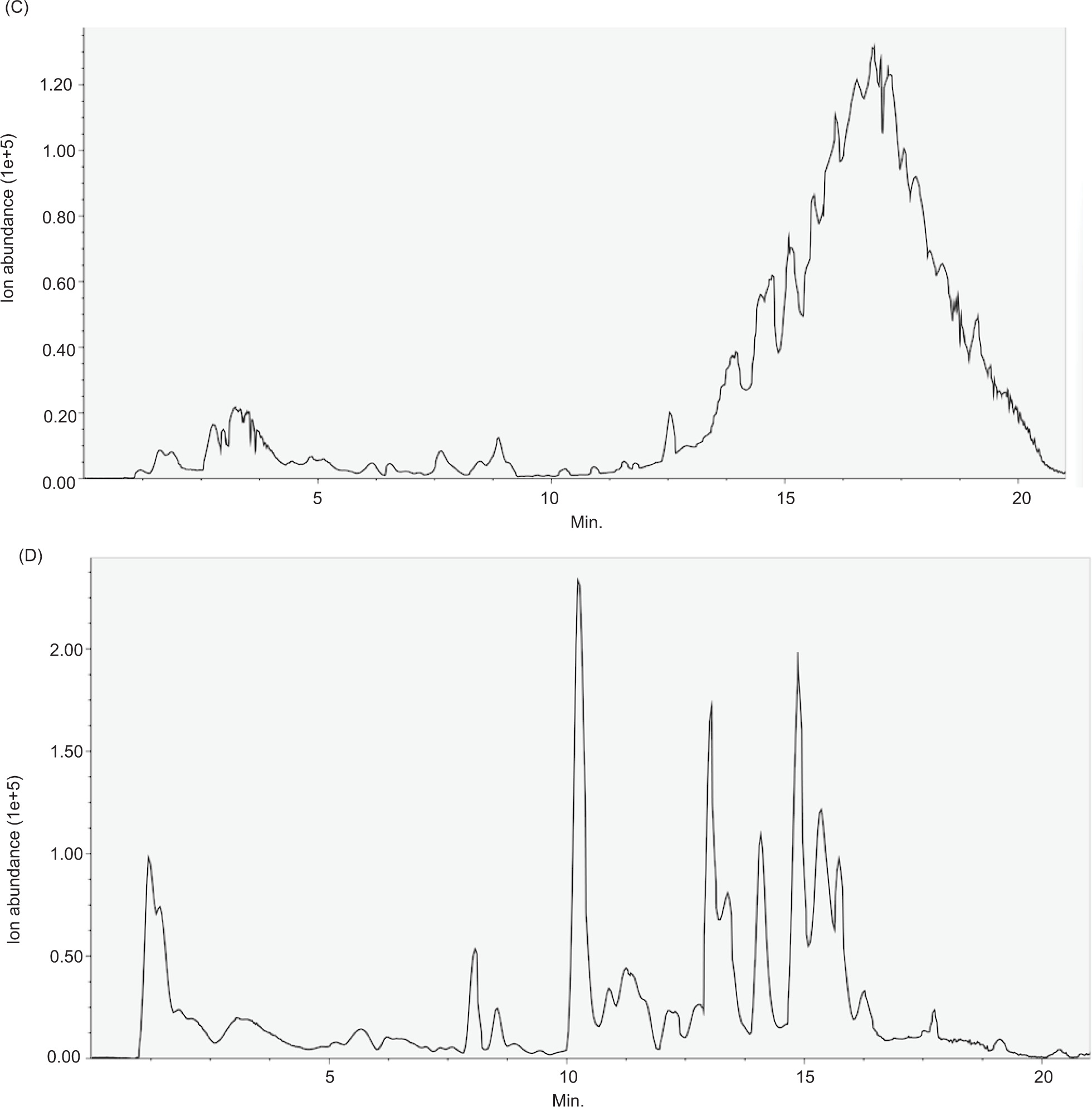 Figure S1. Full-scan ion abundance profile chromatogram in different ion modes of L. edodes and L. decastes. (C) positive ion mode chromatogram of L. decastes, and (D) negative ion pattern chromatogram of L. decastes.