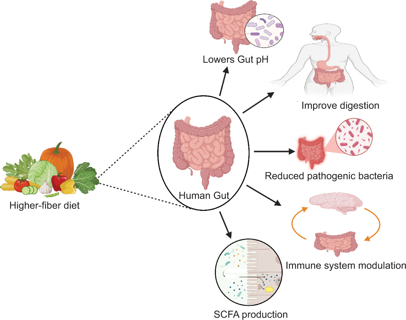 Fiber is vital for a healthy microbiome because it helps to determine the abundance and types of ends in the colon, promotes normal bowel movements crucial to prevent autointoxication by removing waste products quickly from the body at least once daily, and supports gut lining integrity (Loo et al., 2020). Arguably, the most important factor in gut health is a diverse diet rich in fiber, which can help to maintain balance between various species of beneficial bacteria and pathogens that form part of person’s normal flora (Fuller et al., 2016). In the presence of fiber in the diet, it is fermented by gut bacteria to form SCFAs. They offer several health benefits: immune-boosting, anti-inflammatory, and a possible anticancer effect for colon cancer (Koh et al., 2016). Dietary fiber binds with water, which is essential to support health of the digestive system, because this provides stool a greater volume and improves the speed with which it moves through the digestive system. Apart from the treatment of constipation, this procedure decreases the prevalence of GI disorders by aiding the removal of old impacted waste (Baky et al., 2024). Fiber intake is also important for gut homeostasis because it manifests that the balance of microbiota is maintained and averts diseases, such as diverticulosis and irritable bowel syndrome (IBS; Cui et al., 2019; Hussain et al., 2020). While soluble fiber is vital in the regulation of cholesterol and for the production of SCFAs, which are beneficial for gut health, insoluble dietary fiber, which is found in whole grains, fruits, and vegetables, assists immensely with bowel regularity (Joye, 2020; Korczak and Slavin, 2020). Fiber plays an important role in the regulation of gut microbiota, influencing metabolic health, and averting chronic conditions, such as obesity and CVDs, as demonstrated by recent studies (Tosh and Bordenave, 2020; Wang et al., 2021). The optimal intake of dietary fiber, from both natural and added sources, including whole fruits, vegetables, legumes, and nuts, is necessary to sustain long-term health and reduce the risk of diseases, considering the widespread ‘fiber gap’ that is impacting various populations (Ioniță-Mîndrican et al., 2022; Stephen et al., 2017).