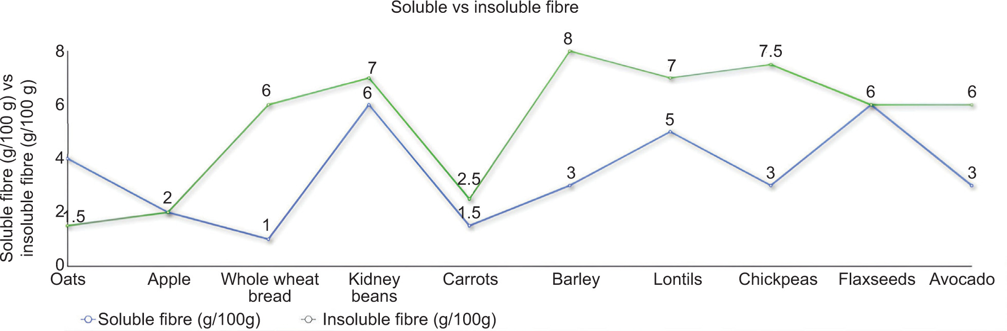 Fruits and vegetables are filled with both soluble and insoluble fiber. Fruits that are high in soluble fiber, such as berries, oranges, pears, and apples, decrease cholesterol and keep blood sugars under control (Hussain et al., 2020). Fruit skins (not bananas, but that of apples and pears) are the best source of insoluble fiber that aids digestion and does not cause constipation (Cui et al., 2019). Broccoli, brussel sprouts, and carrots contain a healthy dose of fiber, providing combination of soluble fiber that acts as prebiotics to keep good bacteria in the gut strong. Leafy greens have less fiber than root vegetables listed, but they should still be included as part of an overall fiber-rich diet because leafy greens are a rich source of other essential nutrients, such as vitamins A, C, and K (Dinan and Cryan, 2017).