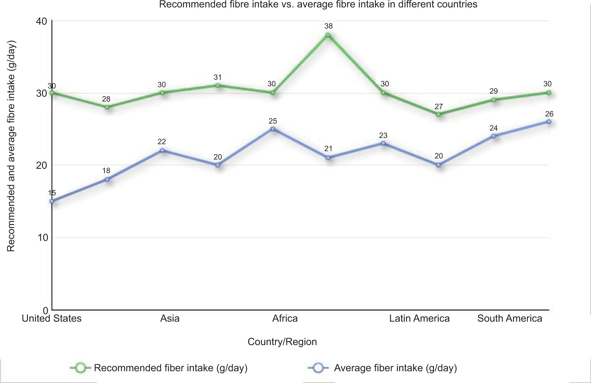 Figure 3. Recommended fiber intake versus average intake in different countries.