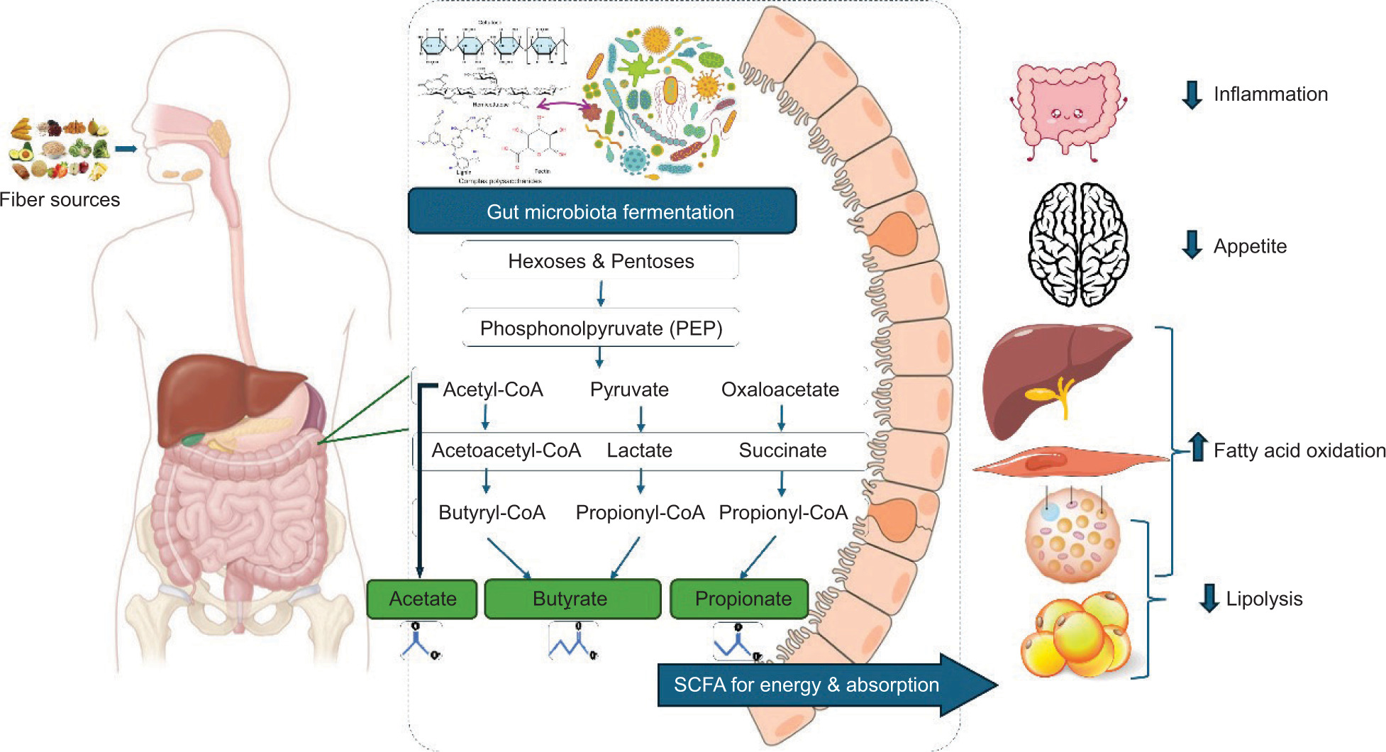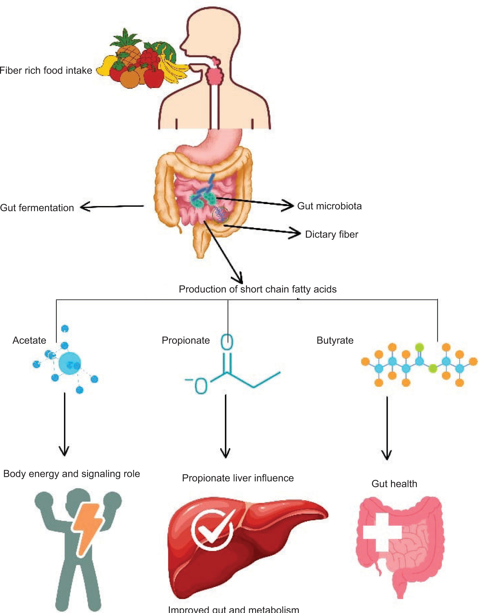 The most important mechanism by which dietary fiber affects gut health is fermentation, particularly that of the SCFAs produced when certain bacterial species ferment fibers (Portincasa et al., 2022). SCFAs are produced during fermentation when bacteria break down fiber into components that include acetate (precursor energy and a signaling molecule), propionate (which influences the liver) and butyrate; SCFA plays a major role in gut health and metabolism (Lee and Kim, 2021). Figure 5 shows the fermentation and production of SCFAs.