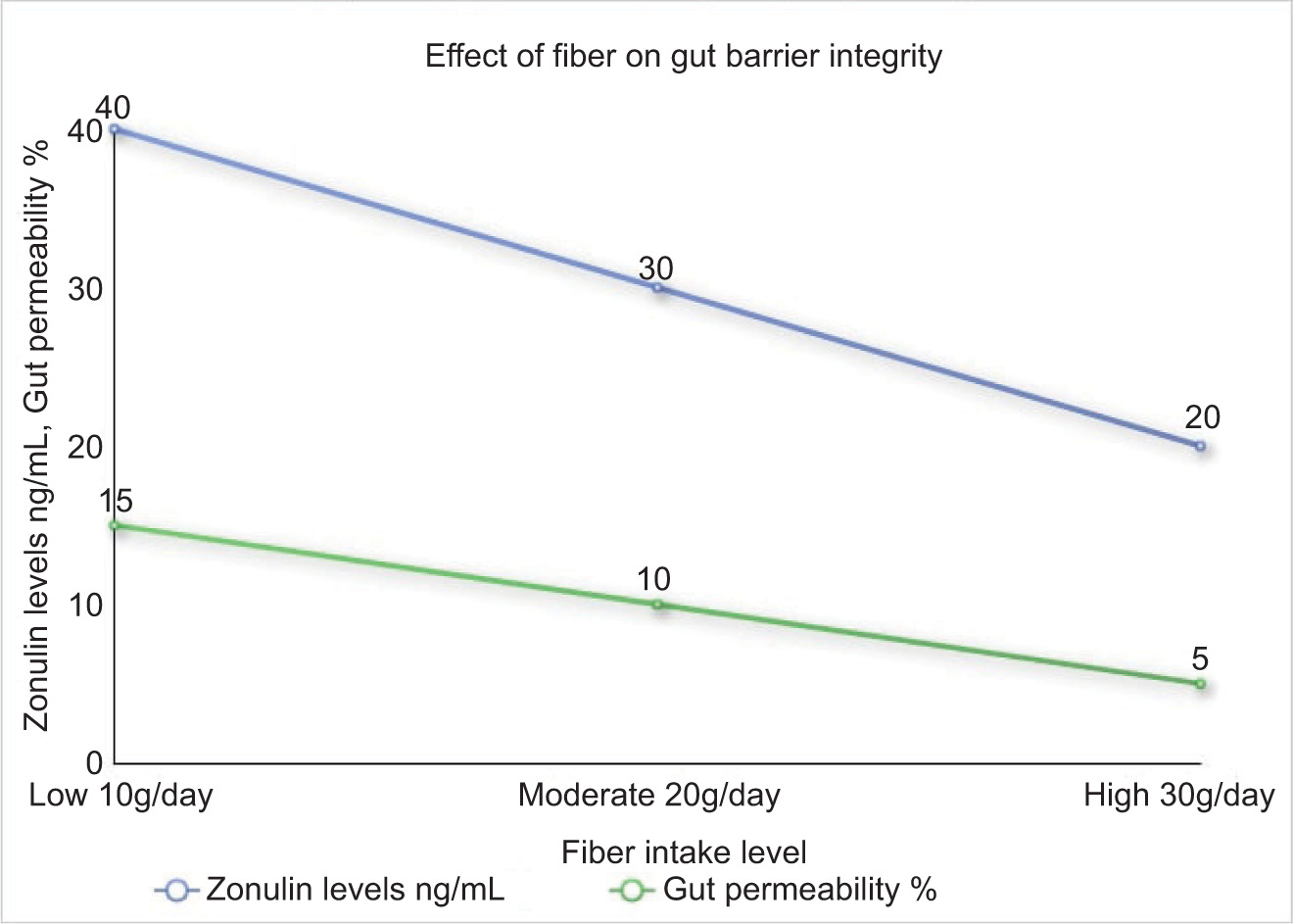 The gut or intestinal barrier is an intricate system that contributes centrally to balance homeostasis and defend the body against harmful compounds. This barrier consists of a monolayer of intestinal epithelial cells linked by protein claudins and occludins that prevent pathogens, toxins, and undigested food particles from translocating into the bloodstream (Dai and Chau, 2017). This barrier provides a critical defense against systemic inflammation and immune tolerance. The gut microbiota plays many crucial roles in the proper functioning of intestinal lining, and one such role is that it helps to maintain the integrity of this barrier. SCFAs, particularly butyrate, are an energy source for colonocytes and one of the key signaling molecules that helps to maintain the integrity of gut barrier (Debnath et al., 2019). An intact and effective gut barrier protects the immune system from harmful substances (such as bacterial endotoxin), which would otherwise enter the general circulation, contributing to chronic inflammation that drives many diseases (Chen et al., 2019). The integrity of gut barrier is heavily influenced by dietary patterns. Diets rich in fiber strengthen GI barrier as they improve the production of SCFAs and promote eubiotic gut microbiota (Guan et al., 2021; Vinelli et al., 2022). The amendment of gut microbiota through fiber consumption largely inspires gut homeostasis and the overall health circumstances (Cui et al., 2019; Donovan, 2017).