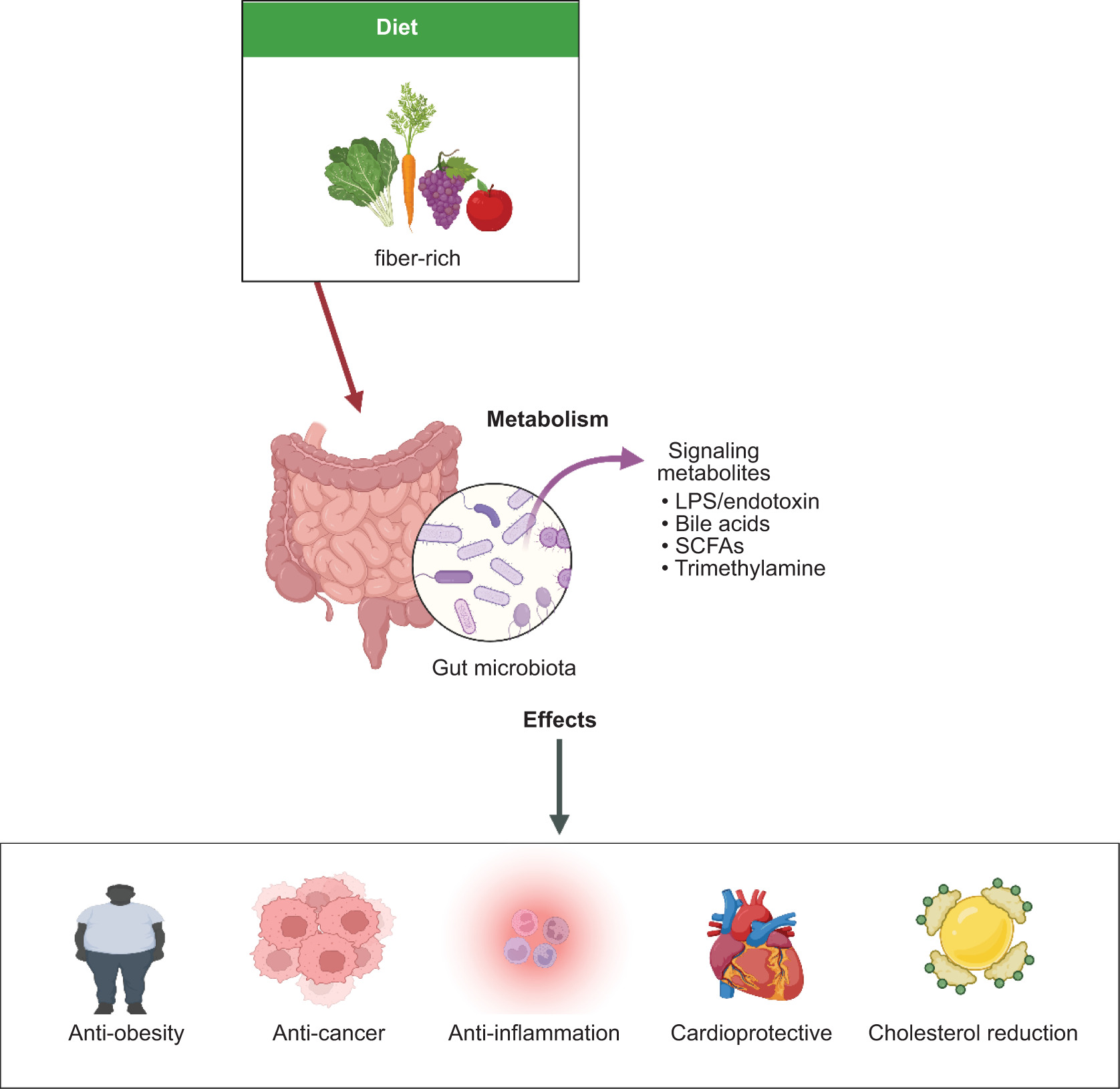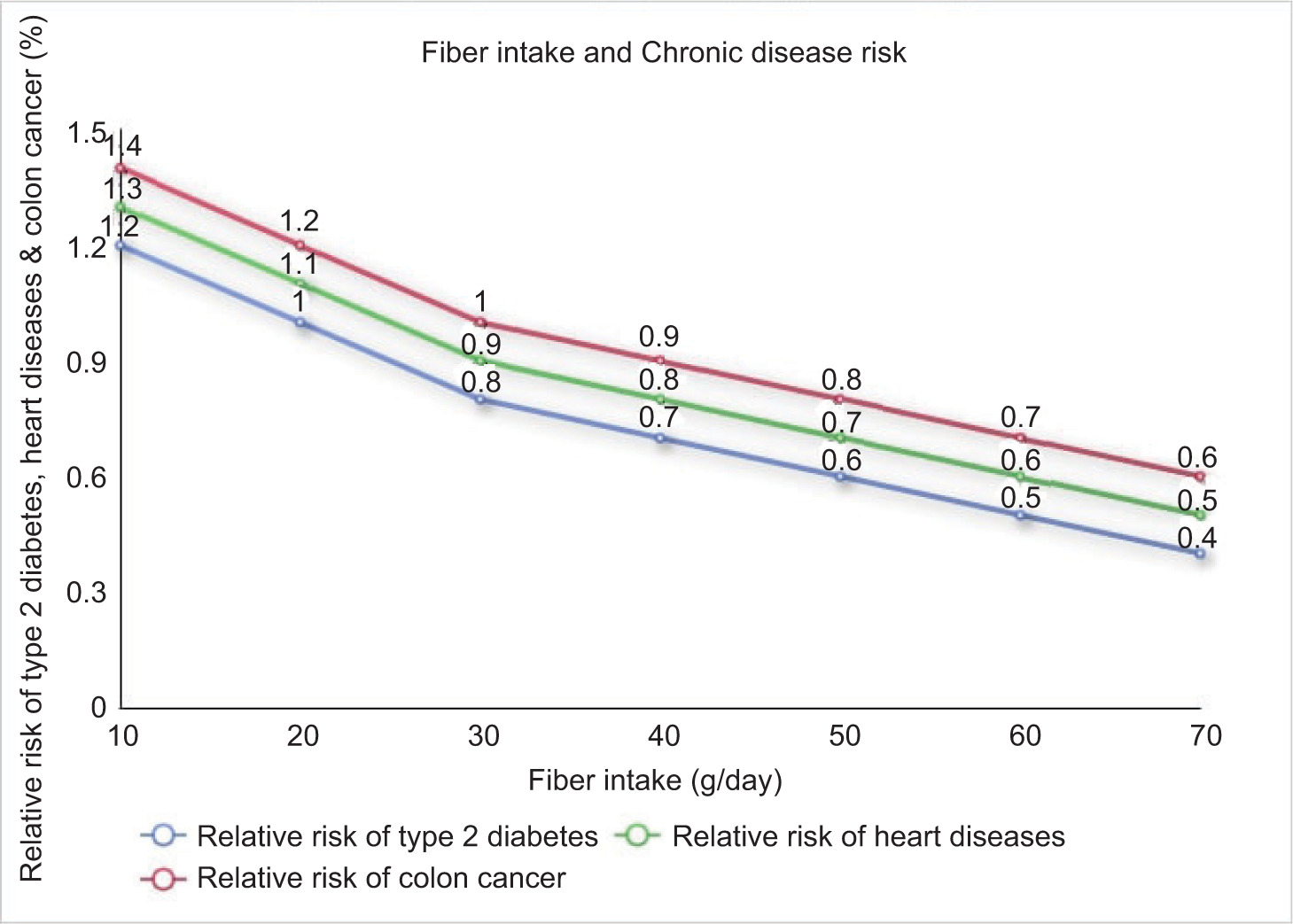 A fiber-rich diet is linked with a reduced risk of numerous chronic illnesses, such as heart disease, type 2 diabetes, and definite types of cancers. Dietary fiber is more than just a gut therapist (Wang et al., 2021). These benefits are believed to be related to the gut microbiota-modulating effects of fiber. For example, regarding the etiology and pathophysiology of obesity-related diseases, other than hypertension, SCFA production by fiber-fermenting bacteria downregulates inflammatory cascades (Bishehsari et al., 2018), improves insulin sensitivity during development and instantaneous biological time, and regulates appetite while reducing body weight (Tremblay et al., 2020). It may also bind bile acids in the gut and help excrete them with faeces, lowering cholesterol levels, which are linked to heart diseases (Bishehsari et al., 2018).