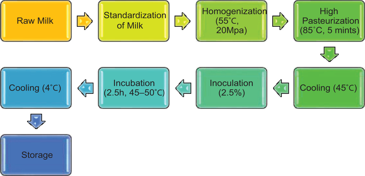 Streptococcus thermophilus and Lactobacillus delbrueckii, subsp. bulgaricus, the two specialized lactic acid-producing bacteria, are cultured in milk to produce yogurt under controlled environmental conditions (Abedin et al., 2024). People use yogurt because it has health benefits. The immune system, metabolism, mental health, and digestive health are benefited from functional yogurt. As per the recommended daily allowance (RDA), yogurt contains between 30% and 45% phosphorus and 40% calcium per serving. Yogurt contains various amino acids, but glycine and proline are particularly significant. Because milk has a high protein content, yogurt is thought to have a positive biological value. Both gastrointestinal (GI) motility and performance of the immune system are enhanced by yogurt. Yogurt contains peptides and proteins that improve physiological activity of the human body, along with minerals (calcium and phosphorus), proteins, carbohydrates, vitamins (cobalamin, folate, niacin, riboflavin, vitamin A, and thiamine), and other nutrients (Pannerchelvan et al., 2024). The microbial communities that inhabit the vagina of wholesome reproductive age women typically incorporate high proportions of Lactobacillus spp., which are ruled by Lactobacillus iners, Lactobacillus crispatus, Lactobacillus gasseri, and Lactobacillus jensenii (Altaf et al., 2022). The body’s cholesterol level and lipid profile are reduced by lactic acid bacteria (LAB; Saeed et al., 2023). The pH of yogurt varies between 4.4 and 4.6. Numerous factors contribute to the sourness of yogurt. For instance, if the pH is low (4.4), it indicates that the milk used to make yogurt is of inferior quality and the starter culture is likewise tainted. The culture of Lactobacillus delbrueckii subsp. bulgaricus is also responsible for the bitter flavor of yogurt. Because it lowers the pH of milk, lactic acid is advantageous for producing yogurt (Ikram et al., 2021). Yogurt’s thermophilic culture, which grows at 40–45°C, causes acidity and fermentation of milk. The required ingredients to prepare yogurt are 8.25% milk solids, 3.25% milk fat, and a titrable acidity of at least 0.9% (Sionek et al., 2024).